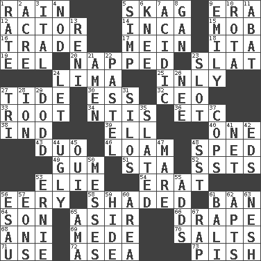 ACROSS 1. Water falling in drops from the sky 5. Heroin 9. Epoch 12. Thespian 14. South American Indian 15. Disorderly crowd 16. Exchange 17. Count _ (2 wds.) 18. Call ___ day 19. Snakelike fish 20. Slept 23. Narrow board 24. Pale green bean 25. Inwardly 27. Event that recurs at intervals 30. Curvy letter 32. Corporate head (abbr.) 33. Carrot, for example 34. Nuclear Threat Initiatives 36. And so on (abbr.) 38. Working for oneself (abbr.) 39. Pipe bend 40. Single 43. Superhero pair 46. Rich soil 48. Moved rapidly 49. Chewing product 51. R.R. building 52. Fast planes 53. Writer Wiesel 54. Part of Q.E.F. 56. Suggestive of the supernatural 58. Cast a shadow over 61. Forbid 64. Male offspring 65. SW Saudi Arabia district 66. Window treatment 68. Black tropical American cuckoo 69. Ancient Persian 70. Table seasonings 71. Purpose 72. At sea 73. Expression of disdain DOWN 1. Pace 2. Measure of real estate 3. Slanted text style (abbr.) 4. Dreamland 5. Simple or foolish person 6. Leg joint 7. Being or containing an acid 8. Separate the seeds from cotton 9. Poet Dickinson 10. Round or rotation of duties 11. Blind as ____ 13. Painter Guido (1575-1642) 21. So be it 22. Soft color 23. Groove 24. Allow 26. Born 27. Three (prefix) 28. Electrically charged atom 29. Texas town _ City 31. Grain storage towers 35. Scheduled 37. 911 reaches them 41. Fish or hair follower 42. Begley and Asner 44. Unsightly 45. Fr. "Yes" 47. Female horse 48. Fast jet (abbr.) 50. Makes clutter 53. Bert's buddy 55. Does sums 56. He sold his birthright 57. Immeasurably long periods of time 59. Flintstone garb 60. Length times width 61. Indonesian resort city 62. Flats, for short 63. Soft 65. Housemaid (var.) 67. Hit sharply and swiftly