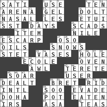 ACROSS 1. Suttee (variant) 5. Purpose 8. "___ Little Indians" 11. Sports stadium 13. Set 14. Dunce 15. Rhinal 16. French article 17. Needle holder 18. Fast jet (abbr.) 19. 24-hour periods 21. Oodles 22. A distinct part 24. "Death on the ____" 25. Fortification 27. Bear (Spanish) 29. Lubricates 30. Frozen precipitation (plural) 32. Proofreading order 33. Flower holders 35. Hollow 39. Learning spot: Fr. 41. Baking chamber 42. Leather borer 43. Cigar-shaped 45. Fly high 48. One who makes use of a thing 49. Started a card game 50. Cy Young winner Saberhagen 52. To free from 55. International (abbr.) 56. "Barney Miller" actor Jack 57. Elude 59. Capital of the state of Qatar 60. Cooking vessel 61. Consumed 62. Big collection agency 63. White ___ sheet 64. Beverages made from leaves DOWN 1. Without 2. Caspian sea tributary 3. A testis 4. _ tizzy (2 wds.) 5. Unsightly 6. Observes 7. Raised railways 8. Add up to 9. Dodge 10. Nuclear Threat Initiatives 12. Tree or shrub in the Birch family 14. Tenth: prefix 20. Electrical Unit 21. Overwhelm 23. Clothes sense 25. Greek goddess of the dawn 26. Be seated 27. Single 28. Mayday 30. Compass dir. 31. Dinah or Pauly 33. Solemn pledge 34. Everything 36. Make much ado about nothing 37. Allow 38. Compass dir. 40. Heavy open wagon 43. Third day of the wk. 44. First name in cosmetics 45. Sir (Sp.) 46. Profane or obscene expressions 47. Silent film actress Nazimova 49. "You Light Up My Life" star Conn 50. Scornful sounds 51. Round or rotation of duties 53. The main thing one is thinking about 54. Hiding places for outlaws 56. Health resort 58. Large container