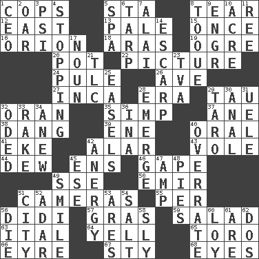 ACROSS 1. 911 reaches them 5. R.R. building 8. Separate forcefully 12. 90 degrees 13. Diluted with white 15. Single time 16. Constellation of myth 18. Caspian sea tributary 19. Legendary monster 20. Cooking vessel 22. Photo 24. Whine 26. "___ Maria" 27. South American Indian 28. Epoch 29. The 19th letter of the Greek alphabet 32. Northwest Algerian city 35. Simple or foolish person 37. A saturated hydrocarbon 38. Mild oath, euphamism for damn 39. Compass dir. 40. Of the mouth 41. Supplement with great effort 42. Having or resembling wings 43. Grand slam 44. Morning condensation 45. Followers of ems 46. Stare wonderingly 49. Compass dir. 50. Independent ruler or chieftain 51. Devices for capturing images 55. For each 56. "You Light Up My Life" star Conn 57. Pate de foie ____ 59. Vegetable dish 63. Slanted text style (abbr.) 64. Shout 65. "Corrida" creature 66. Jane of fiction 67. Filthy place 68. Sight organs DOWN 1. Corporate head (abbr.) 2. Boat paddle 3. Air pressure measure (abbr.) 4. Halting 5. Health resort 6. Canvas cover 7. Jai ____ 8. Woman's close-fitting hat 9. Engineer (abbr.) 10. 1/640 square mile 11. To sift 14. Fortification 17. Part of speech 21. Affectionate concern, for short 23. Federal power corp. 25. Artist's stands 28. Develop 29. Edible starchy tuberous root 30. Of or related to the anus 31. Ubangi River tributary 32. Wrote a lyric poem 33. Immoral or dissolute person 34. Afresh 36. _ tizzy (2 wds.) 40. Make much ado about nothing 42. Disorder of the immune system 45. Compass dir. 47. Electrical Unit 48. Sliced desserts 49. Grin 51. Municipality 52. The sixth month of the Jewish calendar 53. Ancient Greek god of war 54. Table seasoning 56. Pass on 58. Mischievous 60. Myrna of the movies 61. "We ___ not amused" (Victoria) 62. Two (Sp.)