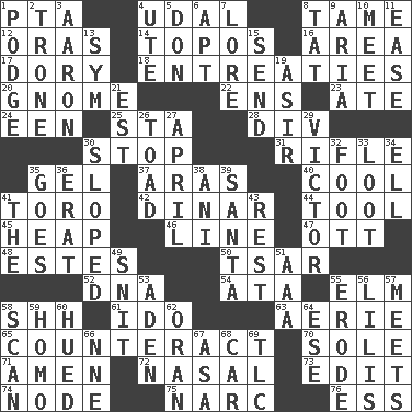 ACROSS 1. Parent Teacher Assoc. 4. Allodial 8. Not wild 12. Mouths or openings 14. Traditional theme or motif 16. Type of rug 17. Dinghy 18. Pleas 20. Dwarf 22. Followers of ems 23. Had dinner 24. Car or cant ending 25. R.R. building 28. HTML Container Element 30. Discontinue 31. Firearm 35. Set 37. Ancient river in northeast Turkey 40. Calm and collected 41. "Corrida" creature 42. Middle Eastern gold or silver currency 44. Implement 45. Pile 46. Actor's bit 47. Baseball player Mel 48. _____ Park, CO 50. Russian ruler of old 52. Heredity factor (abbr.) 54. _ moment's notice (2 wds.) 55. Shade tree 58. Quiet! 61. Wedding promise 63. Nest on high 65. Frustrate 70. Flatfish 71. So be it 72. Relating to the nose 73. Prepare for publication 74. Connecting point 75. Drug cop 76. Double-curved letter DOWN 1. Plash 2. Marketplace scale 3. Composer Copland 4. Shoshoni 5. Spanish title 6. Fitting 7. Old wives' tales, e.g. 8. Make lace 9. Operatic vocal solo 10. Confront 11. Comfort 13. Symbol (abbr.) 15. Post 19. SW Saudi Arabia district 21. Eastern Standard Time (abbr.) 26. Frog relative 27. Showery time 29. Winning man's name 30. Inclined 32. One third of a yard 33. Plunder 34. Pipe bend 35. Travels 36. Part of Q.E.F. 38. Black tropical American cuckoo 39. Before Barbara or Clara 41. Definite Article 43. Take ten 49. In a ____ (agitated or irritated) 51. American Automobile Association (abbr.) 53. Arabian gulf 55. Eat (away) 56. Ms. Damita and namesakes 57. Confronts 58. Examine hastily 59. Like (prefix) 60. Became colored 62. Northwest Algerian city 64. Compass dir. 66. Compass dir. 67. White ___ sheet 68. 4-wheeled motor vehicle 69. Affectionate concern, for short