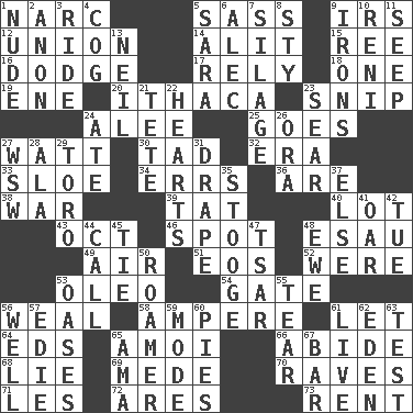ACROSS 1. Drug cop 5. Backtalk 9. Big collection agency 12. The state of being joined or united 14. Came down and settled, as after flight 15. To sift 16. Evade 17. Depend 18. Single 19. Compass dir. 20. New York city 23. Sever or remove by pinching or nipping 24. Toward shelter 25. Moves 27. Electrical Unit 30. Bit 32. Period 33. A type of plum 34. Blunders 36. "We ___ not amused" (Victoria) 38. Armed conflict 39. Make lace 40. Car dealer's back yard 43. Sep. follower 46. Blemish 48. Son of Isaac 49. Wind 51. Greek goddess of the dawn 52. We are 53. Margarine 54. Yard entry 56. Welt 58. Electrical Unit 61. Allow 64. Begley and Asner 65. Mine, in Marseilles 66. Remain 68. Falsehood 69. Ancient Persian 70. All-night dance parties 71. French article 72. Ancient Greek god of war 73. Monthly bill DOWN 1. Naked 2. Soon (poet.) 3. Travel on or in a vehicle 4. Gear tooth 5. "Two Mules for Sister ____" 6. Actor Baldwin 7. Fodder prepared in a silo 8. Filthy place 9. Removes the wrinkles 10. Painter Guido (1575-1642) 11. Ooze 13. Famous astronaut Armstrong 21. False hair 22. Centers of feelings and intuitions 23. Burn superficially 24. Had dinner 26. Mouth or opening 27. Compass dir. 28. Wing 29. "Corrida" creature 31. Window treatment 35. Moe Howard, for one 37. Otherwise 41. Boat paddle 42. Third day of the wk. 44. Give a ring to 45. Make a knot 47. Russian ruler of old 48. She-sheep 50. Nomad 53. Fertile tracts in a desert 55. Pull apart 56. Water source 57. Singer Brickell 59. Method 60. Sliced desserts 61. Moving, as bait 62. Locale of original sin 63. Trial 65. Wet nurse (var.) 67. Oblong piece of solid material