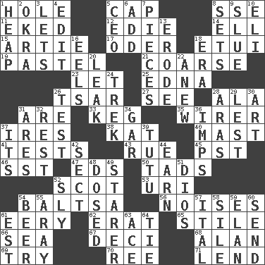 ACROSS 1. Hollow 5. Head covering 8. Compass dir. 11. Made supply last 12. Singer Brickell 14. Pipe bend 15. Nick name for Arthur 17. Baltic tributary 18. Needle holder 19. Soft color 21. Rough 23. Allow 25. Pulitzer Prize-winning author Ferber 26. Russian ruler of old 27. Perceive with the eye 28. In the manner of 31. "We ___ not amused" (Victoria) 33. Barrel 35. One who wires 37. Angers 38. Krazy ___ of comics 40. Vertical spar for supporting sails 41. Trials 43. Regret 45. Pacific Standard Time (abbr.) 46. Fast jet (abbr.) 47. Begley and Asner 50. Bits 52. Native of Scotland 53. RI univ. 54. Greek mezzo-soprano Agnes 56. Annoying sounds 61. Suggestive of the supernatural 62. Part of Q.E.F. 65. Vertical member of a panel or frame 66. Ocean 67. Tenth: prefix 68. Actor Alda or Thicke 69. Attempt to accomplish something 70. Portuguese money of account (variant) 71. Grant temporary use of DOWN 1. Pile 2. Gumbo ingredient 3. Allows 4. Prepare for publication 5. Corporate head (abbr.) 6. Say or write further 7. Components 8. Arranges properly for use 9. Change direction abruptly 10. Connecticut Ivy Leaguer 13. Wear away 16. Snakelike fish 18. Epoch 20. Path through which fluid escapes 22. Afresh 24. Long journey 26. Trial 28. Caspian sea tributary 29. For fear that 30. Tate display 31. Ancient Greek god of war 32. Repose 34. Slender fish 36. Naughty children 37. ___ a Wonderful Life 39. Ballerina skirt 42. Religious group 44. Merit 48. Administered medicine 49. A viewer who gazes fixedly 51. "Vaya con ____" 52. Wily 54. Fermented drink made from hops 55. Like ___ of sunshine 57. Slanted text style (abbr.) 58. Filth; sediment 59. Liveliness 60. Transmit 61. Eastern Standard Time (abbr.) 63. Adept person 64. Make a knot