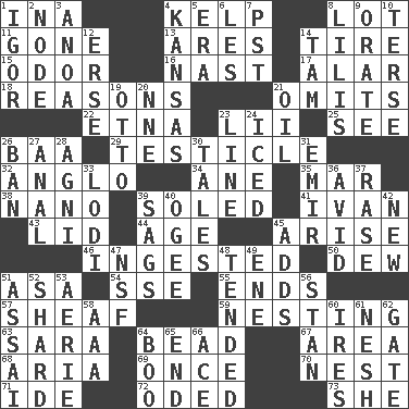 ACROSS 1. _ tizzy (2 wds.) 4. Seaweed 8. Car dealer's back yard 11. Went 13. Ancient Greek god of war 14. Become fatigued 15. Aroma 16. Political cartoonist Thomas 17. Having or resembling wings 18. Thinks logically 21. Leaves out 22. Inactive volcano in Sicily 23. Cards in a Roman deck? 25. Observe 26. Sound made by sheep 29. One of the two male reproductive glands 32. White American of non-Hispanic descent 34. One (Scot) 35. Make imperfect 38. Billionth: prefix 39. Having a sole or soles 41. _ the terrible 43. Flaplike covering 44. Ripen 45. Originate 46. Consumed 50. Morning condensation 51. White ___ sheet 54. Compass dir. 55. Conclusions 57. To gather and bind into a bundle 59. Inhabiting a nest 63. "Two Mules for Sister ____" 64. Necklace unit 67. Type of rug 68. Operatic vocal solo 69. Single time 70. A home for chicks 71. Binary compound 72. Wrote a lyric poem 73. A female animal or person DOWN 1. Composer Stravinsky 2. Thickened enlargement 3. Small Philippine buffalo 4. Sunflower state 5. Period 6. French article 7. Pacific Standard Time (abbr.) 8. Ms. Damita and namesakes 9. Declaim 10. Laconic 12. Celtic language 14. Scottish cap 19. Von Bismarck 20. Compass dir. 21. Lubricate 23. Actor's bit 24. On the rocks 26. Forbid 27. Of or related to the anus 28. Hindu god of fire 30. Falsehoods 31. Independent ruler or chieftain 33. Farming town in central California 36. Enthusiastic 37. Raze (variant) 39. Sinks 40. Double curve, resembling the letter S 42. ___ Haven, CT 45. Does sums 47. Science/research agcy. 48. Looked after 49. Compass dir. 51. Slender Brazilian palm 52. Pottery fragment 53. Nest on high 56. Comedian Laurel of Laurel & Hardy 58. Auto club (abbr.) 60. Angers 61. Delicate 62. Yard entry 64. Surprise greeting 65. Conclude 66. Adept person