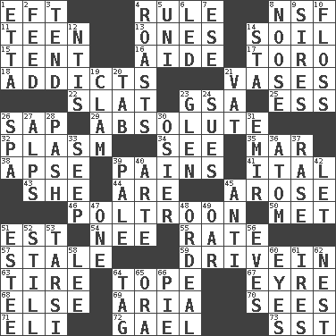 ACROSS 1. Bank Draft (abbr.) 4. Governing power 8. Science/research agcy. 11. Adolescent 13. Singles 14. Earth 15. Portable shelter 16. Helper 17. "Corrida" creature 18. Inveterate users 21. Flower holders 22. Narrow board 23. Girls' org. (abbr.) 25. Curvy letter 26. Plant excrement 29. Utter; complete 32. Suffix with ecto or cyto 34. Observe 35. Make imperfect 38. Domed church section 39. Aches 41. Slanted text style (abbr.) 43. A female animal or person 44. "We ___ not amused" (Victoria) 45. Came up 46. Characterized by complete cowardliness 50. Was introduced to 51. Eastern Standard Time (abbr.) 54. Born 55. Pace 57. Lacking originality or spontaneity 59. Popular '50s hangout 63. Hoop that covers a wheel 64. Drink excessively 67. Jane of fiction 68. Otherwise 69. Operatic vocal solo 70. Perceives with the eye 71. Biblical high priest 72. Highlander 73. Fast jet (abbr.) DOWN 1. Singer James 2. Nourish 3. Watch over 4. Cooks with dry heat, as in an oven 5. Single; one (prefix) 6. Directed 7. Compass dir. 8. Trap for birds or small mammals 9. Founders of families 10. Soft thread for cleaning between teeth 12. Nuclear Threat Initiatives 14. R.R. building 19. Burrowing marine mollusk 20. Bar bill 21. Large container 23. Small, secluded valley 24. Takes to court 26. Health resort 27. High mountains 28. Romantic infatuation 30. Flexible twig of a willow tree 31. Arab leader 33. Ooze 36. Smallest unit of an element 37. Raze (variant) 39. Diluted with white 40. Johnson of "Laugh-In" 42. Allow 45. Opposed to 47. Single 48. Severe or trying experience 49. Boat paddle 51. First name in cosmetics 52. Free from disturbance or agitation 53. Tarsus (plural) 56. Nights before holidays 58. Area sheltered from the wind 60. Sight organs 61. Angers 62. A home for chicks 64. Label 65. Mouth or opening 66. Sliced dessert