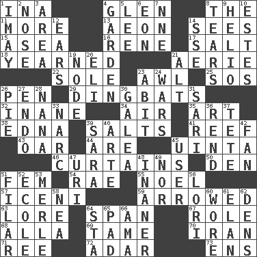 ACROSS 1. _ tizzy (2 wds.) 4. Small, secluded valley 8. Definite Article 11. Greater amount 13. A really long time 14. Perceives with the eye 15. At sea 16. French philosopher Descartes 17. Table seasoning 18. Felt deep pity or tenderness 21. Nest on high 22. Not divided or shared with others 23. Leather borer 25. Mayday 26. Animal enclosure 29. Empty-headed or silly people 32. Empty; void 34. Wind 35. Nonscientific branch of learning 38. Pulitzer Prize-winning author Ferber 39. Table seasonings 41. Coral collection 43. Rowing implement 44. "We ___ not amused" (Victoria) 45. National forest in Provo, Utah 46. Window treatments 50. Lair 51. Opposite of masc. 54. Actress Charlotte 55. Christmas carol 57. Ancient Celtic tribe of eastern Britain 59. Moved like an arrow 63. Old wives' tales, e.g. 64. Connect, as a bridge 67. Hero or heavy, e.g. 68. Silent film actress Nazimova 69. Docile 70. SW Asia republic 71. Portuguese money of account (variant) 72. The sixth month of the Jewish calendar 73. Followers of ems DOWN 1. "If ____ say so..." 2. Sense of smell 3. Length times width 4. Place where plants grow 5. Area sheltered from the wind 6. A really long time 7. Compass dir. 8. Lacerates 9. Sun: prefix 10. _____ Park, CO 12. Hearing organs 14. Compass dir. 19. Thickened enlargement 20. Connecticut Ivy Leaguer 21. The first octave above the treble staff 23. "This won't hurt ____!" 24. Armed conflicts 26. Sliced dessert 27. Inside; within (prefix) 28. Grandmother 30. An organ shaped like a helmet 31. Indian skirt 33. Drug cop 36. Tear apart 37. Wig 39. "Two Mules for Sister ____" 40. Johnson of "Laugh-In" 42. Air blower 45. One who uses or employs something 47. RI univ. 48. Sillier 49. Or not 51. Of or pertaining to a thread or threads 52. Learning spot: Fr. 53. Haggard of country music 56. Australian parrot (variant) 58. Teachers' org. 60. Had on 61. Liveliness 62. Cub Scout units 64. R.R. building 65. Groovy apt. 66. Nursemaid (var.)