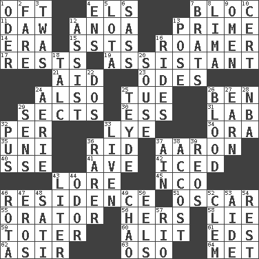 ACROSS 1. Often (poetically) 4. Raised railways 7. Group of countries in special alliance 11. Simpleton 12. Small Philippine buffalo 13. A-one 14. Epoch 15. Fast planes 16. Wanderer 17. Musical pauses 19. Aide 21. Assist 23. Lyric poems 24. In addition 25. Third day of the wk. 26. Benjamin's nick name 29. Religious groups 30. Double-curved letter 31. Experiment locale 32. For each 33. Sodium hydroxide 34. Mouth or opening 35. Single; one (prefix) 36. To free from 37. Composer Copland 40. Compass dir. 41. "___ Maria" 42. On the rocks 43. Old wives' tales, e.g. 45. Non-commissioned officer (abbr.) 46. Home 51. Motion picture award 55. Speaker 56. Possessive pronoun 58. Untruth 59. Carrier 60. Set down 61. Begley and Asner 62. SW Saudi Arabia district 63. Bear (Spanish) 64. Was introduced to DOWN 1. River in Europe 2. Conductor's collection 3. It was, poetically 4. Followers of ems 5. Globular water bottle used in Asia 6. Backtalk 7. Naughty children 8. Pale green bean 9. Presage 10. Sure thing 12. Aid 13. Airs 16. Amusement-park features 18. Baby powder 20. Lush 22. Two (Sp.) 24. Nest on high 25. Miss Universe 1986, Barbara Palacios _ 26. Vital fluid 27. Merit 28. Basketball assoc. 29. Elected reps. 32. Purulenc 33. Make or become more lively 36. More valued for its uncommonness 37. The 18th letter of the Arabic alphabet 38. Buttonhole 39. Vintage cars 43. 61 cubic inches 44. Aroma 46. Roll call or roster of names 47. Greek god of love 48. Suttee (variant) 49. US Secretary of Labor Elaine L. _ 50. Snakelike fish 52. To starve (Brit.) 53. Assistant 54. Repose 57. River (Sp.)