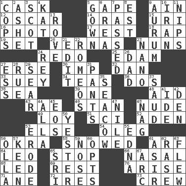 ACROSS 1. Keg 5. Open wide 9. The 18th letter of the Arabic alphabet 12. Witty Wilde 14. Mouths or openings 15. RI univ. 16. Picture 17. Compass direction 18. Hit sharply and swiftly 19. Arrange properly for use 20. Actresses Bloom and Felton 23. Religious women 24. Do over again 25. Dutch treat 27. Celtic language 30. Mischievous child 32. One of the 12 tribes of Israel 33. Chop _ 34. Afternoon social gatherings 36. Two (Sp.) 38. Ocean 39. Single 40. Help 43. Actress Charlotte 46. Comedian Laurel of Laurel & Hardy 48. Unadorned 49. Myrna of the movies 51. _-fi 52. Arabian gulf 53. Otherwise 54. Cassini of fashion 56. Gumbo ingredient 58. Frozen precipiation fell 61. Sandy's bark 64. Lion 65. Obstruct or block passage 66. Relating to the nose 68. Directed 69. State of inaction 70. Originate 71. A saturated hydrocarbon 72. Angers 73. Group working together DOWN 1. 911 reaches them 2. American tennis player Robert 3. Highlander 4. Krazy ___ of comics 5. Bride's dress 6. Length times width 7. Went by 8. Eastern Standard Time (abbr.) 9. Gold (Symbol: Au) 10. SW Asia republic 11. Cuts off 13. Be footloose 21. Prepare for publication 22. Lover boys 23. Billionth: prefix 24. Marina Del _, California 26. Male parent 27. Double-curved letter 28. Regret 29. Dry up 31. Leg coverings 35. Manatee 37. Saudi Arabian king (1953-1964) 41. Binary compound 42. Lair 44. Silent film actress Nazimova 45. Greek goddess of the dawn 47. Mediterranean tributary 48. Tired old horse 50. Of or pertaining to yesterday 53. Wear away 55. Pulitzer Prize-winning author Ferber 56. Rounded earthenware pot or jar 57. Peachy ____! 59. Characteristic smell of wine 60. Elects 61. SW Saudi Arabia district 62. To erase 63. Soared 65. _ Lanka 67. Curve