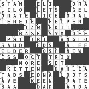 ACROSS 1. Comedian Laurel of Laurel & Hardy 5. Biblical high priest 8. Mouth or opening 11. _ and Stitch 12. Allows 14. Set 15. Speak pompously 17. Louse (plural) 18. Of the mouth 19. Cigar-shaped 21. Assistant 23. The 23rd letter of the Hebrew alphabet 25. Prepare for publication 26. Raze (variant) 27. Symbol (abbr.) 28. Not in operation 31. 23rd letter of the Greek alphabet 33. Three (prefix) 35. White American of non-Hispanic descent 37. Saudi Arabian king (1953-1964) 38. Begley and Asner 40. Toward shelter 41. A person who is older than you are 43. Order of Saint Francis (abbr.) 45. ___ Haven, CT 46. Double-curved letter 47. Sep. follower 50. Musical group of three 52. Greater amount 53. Put into a specified state 54. Baby cat 56. Mexican or Central American flower 61. Small boys 62. Pulitzer Prize-winning author Ferber 65. Plunders 66. "___ Maria" 67. Peachy ____! 68. Assign a rank or rating to 69. Sound made by sheep 70. Male parent 71. Small Philippine buffalo DOWN 1. Narrow, elongated depression 2. Become fatigued 3. Having or resembling wings 4. Brief written record 5. Pipe bend 6. Luau accessory 7. Strong, restless desires 8. Legendary monster 9. Located in or toward the back 10. Everything 13. Sleazy 16. Singer James 18. Elect 20. Compass direction 22. Pale green bean 24. Past tense of be (plural) 26. Travel on an animal 28. Stare at amorously 29. Soared 30. Enemy 31. Friends 32. Soap bubbles 34. Wedding promise 36. Billionth: prefix 37. Perceive with the eye 39. Fast planes 42. Carrot, for example 44. Flintstone 48. Small stream 49. Looked after 51. Slanted text style (abbr.) 52. Mountains (abbr.) 54. Polynesian shrub of the pepper family 55. The content of cognition 57. Israeli folk dance 58. Grant temporary use of 59. "Tell ____ the Marines!" 60. Toward the sea 61. Keyboard key 63. Teachers' org. 64. Added to