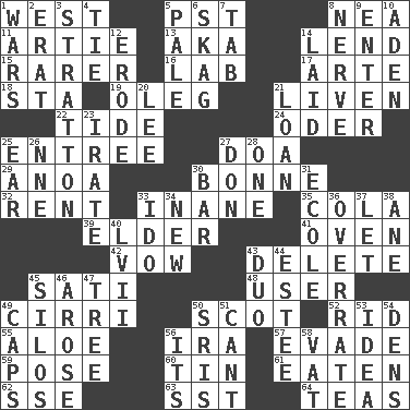 ACROSS 1. Compass direction 5. Pacific Standard Time (abbr.) 8. Teachers' org. 11. Nick name for Arthur 13. Alias (abbr.) 14. Grant temporary use of 15. More valued for its uncommonness 16. Experiment locale 17. Johnson of "Laugh-In" 18. R.R. building 19. Cassini of fashion 21. Make or become more lively 22. Periodic rise and fall of the sea level 24. Baltic tributary 25. Main course 27. ___ good deed 29. Small Philippine buffalo 30. Maid-servant 32. Monthly bill 33. Lacking in sense or substance 35. Root beer relative 39. A person who is older than you are 41. Baking chamber 42. Solemn pledge 43. Keyboard key 45. Suttee (variant) 48. One who uses or employs something 49. High-altitude cloud 50. Highlander 52. To free from 55. Medicinal plant 56. Retirement account (abbr.) 57. Dodge 59. Introduce or present, as a question 60. Metal container 61. Consumed 62. Compass dir. 63. Fast jet (abbr.) 64. Afternoon social gatherings DOWN 1. Armed conflicts 2. Part of Q.E.F. 3. Ski resort town in Vermont 4. Standoff 5. Diluted with white 6. Heroin 7. Keyboard key 8. Effrontery 9. Keyboard key 10. An important port of Yemen 12. Eat (away) 14. Put down 20. Area sheltered from the wind 21. Grant temporary use of 23. Feeling or showing extreme anger 25. Ewer handle 26. Compass dir. 27. Spanish title 28. Single 30. Drinking establishment 31. Learning spot: Fr. 33. Wedding promise 34. ___ Haven, CT 36. Make much ado about nothing 37. Allow 38. A saturated hydrocarbon 40. 57 in ancient Rome 43. Superhero pair 44. First name in cosmetics 45. Grain storage towers 46. Came up 47. Woody plant 49. Smile enhancers 50. Indian titles of respect 51. Patter 53. It may be bright or harebrained 54. Hiding places for outlaws 56. ___ a Wonderful Life 58. Large container