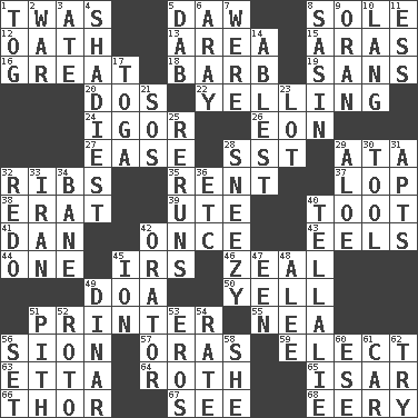ACROSS 1. It was, poetically 5. Fool 8. Not divided or shared with others 12. Pledge 13. Type of rug 15. Ancient river in northeast Turkey 16. Relatively large 18. Sharp remark 19. Without 20. Two (Sp.) 22. Crying or shouting loudly 24. Composer Stravinsky 26. A really long time 27. Comfort 28. Fast jet (abbr.) 29. _ moment's notice (2 wds.) 32. Teases 35. Monthly bill 37. Trim (branches) 38. Part of Q.E.F. 39. Shoshoni 40. A blast of a horn 41. One of the 12 tribes of Israel 42. At one time in the past 43. Snakelike fish 44. Single 45. Big collection agency 46. Ardor 49. ___ good deed 50. Shout 51. Hard copy producer 55. Teachers' org. 56. The Jewish people; Israel 57. Mouths or openings 59. Choose 63. Singer James 64. Writer of Portnoy's Complaint (1969) 65. Austrian river, tributary to the Danube 66. Son of Odin 67. Perceive with the eye 68. Suggestive of the supernatural DOWN 1. Coat; cloak 2. Armed conflict 3. Had dinner 4. Most questionable 5. Apply (a substance) by light strokes 6. Like ___ of sunshine 7. We are 8. Indian antelope 9. Northwest Algerian city 10. Austrian-born American filmmaker Fritz 11. Curvy letter 14. Most capable 17. Ancient Roman robe 21. Mayday 23. Car dealer's back yard 25. Summer TV shows 28. Dwarf with a sinus problem 29. _ vera 30. Utensil 31. Tenement units (abbr.) 32. Make new 33. SW Asia republic 34. Object of repulsion 36. And so on (abbr.) 40. Copy Pinocchio 42. Speaker 45. Electrically charged atom 47. Car or cant ending 48. Toward shelter 49. Middle Eastern gold or silver currency 51. Essential or central part 52. Printing process, for short 53. Greek god of love 54. Pace 56. Put into a specified state 58. A female animal or person 60. Compass dir. 61. Auto 62. Attempt to accomplish something