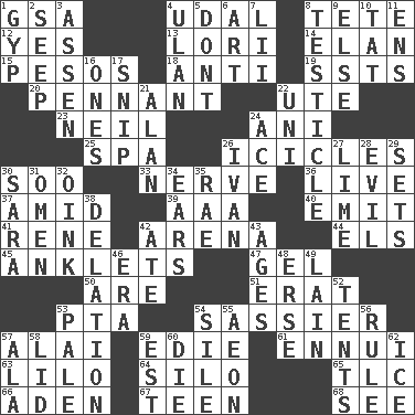 ACROSS 1. Girls' org. (abbr.) 4. Freehold land 8. Wig 12. Affirmative reply 13. Australian parrot (variant) 14. Enthusiasm 15. Mexican monetary units 18. Opposed to 19. Fast planes 20. Pre-World Series prize 22. Shoshoni 23. Famous astronaut Armstrong 24. Cuckoo 25. Health resort 26. Winter's stalactites 30. "Barney Miller" actor Jack 33. Impudent aggressiveness 36. Not recorded 37. Among 39. American Automobile Association (abbr.) 40. Give off 41. French philosopher Descartes 42. Sports stadium 44. Raised railways 45. Short socks 47. Set 50. "We ___ not amused" (Victoria) 51. Part of Q.E.F. 53. Parent Teacher Association (abbr.) 54. More impudent 57. Jai _ 59. Singer Brickell 61. World-weariness 63. _ and Stitch 64. Grain storage tower 65. Affectionate concern, for short 66. Arabian gulf 67. Adolescent 68. Observe DOWN 1. Hustle 2. Ooze 3. NE Netherlands city 4. Uhlan (variant) 5. Do not 6. Tate display 7. Cards in a Roman deck? 8. One of the two male reproductive glands 9. Otherwise 10. Make lace 11. Followers of ems 16. Singles 17. Clip 21. Actor Alda or Thicke 22. Single; one (prefix) 24. Adept person 26. "Terrible" tsar 27. Welles in "The Third Man" 28. Morally bad or wrong 29. Puts into a specified state 30. "Two Mules for Sister ____" 31. Presage 32. Pig sound 34. Hearing organs 35. Actress Charlotte 38. Conveyance 42. Had dinner 43. Matures 46. Epoch 48. Celtic language 49. (Had) reclined 52. Portable shelters 53. Light colored 54. Drop; flow; fall 55. A really long time 56. General guideline 57. Wing 58. Hat (slang) 59. Eastern Standard Time (abbr.) 60. Expire 62. Frozen water