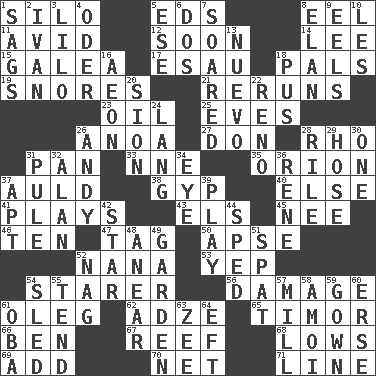 ACROSS 1. Grain storage tower 5. Begley and Asner 8. Snakelike fish 11. Enthusiastic 12. Within a short period 14. Area sheltered from the wind 15. An organ shaped like a helmet 17. Son of Isaac 18. Friends 19. Sounds asleep 21. Summer TV shows 23. Lubricate 25. Nights before holidays 26. Small Philippine buffalo 27. Spanish title 28. 17th letter of the Greek alphabet 31. Baking dish 33. Compass dir. 35. Constellation of myth 37. Old (Scot.) 38. Con 40. Otherwise 41. Live dramatic performances 43. Raised railways 45. Born 46. "___ Little Indians" 47. Label 50. Domed church section 52. Grandmother 53. Slangy assent 54. A viewer who gazes fixedly 56. Break 61. Cassini of fashion 62. Axlike tool, used for shaping wood 65. Southeast Indonesia island 66. Benjamin's nick name 67. Coral ridge 68. Moos 69. Find the sum of 70. Fish or hair follower 71. Actor's bit DOWN 1. Settles 2. "Terrible" tsar 3. _ and Stitch 4. Baltic tributary 5. Compass dir. 6. Two (Sp.) 7. Flew 8. Liveliness 9. Snakelike fish 10. French article 13. New (sp.) 16. Age 18. Suppuration 20. The Jewish people; Israel 22. Western Nevada city 24. Austrian-born American filmmaker Fritz 26. Actor Griffith 28. Cause heat under the collar 29. Flexible conduit 30. Single 31. Whimper 32. Actor Alda or Thicke 34. Sight organ 36. French philosopher Descartes 37. Fitting 39. Romp 42. Play the lead 44. Drove too fast 48. Approach 49. Place where plants grow 51. Petty quarrel 52. Tired old horse 54. Downhill vehicle 55. Be inclined (to) 57. Place where flour is made 58. Mine, in Marseilles 59. Bride's dress 60. Celtic language 61. Chief or king in Benin or Nigeria 63. Last letter of the English alphabet 64. Bank Draft (abbr.)