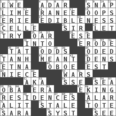 ACROSS 1. She-sheep 4. The sixth month of the Jewish calendar 8. Fastener 12. Welles in "The Third Man" 14. Indian princess (variant) 16. I made a mistake 17. One of the Great Lakes 18. The property of being fit to eat 20. Cell (Danish) 22. Title for a knight 23. Allow 24. Attempt 25. Boat paddle 28. Compass dir. 30. To the inside or interior of 31. Eat (away) 35. Make lace 37. Probability 40. Wrote a lyric poem 41. Hyperbolic tangent 42. Intended 44. Hiding places for outlaws 45. Inactive volcano in Sicily 46. Mitch Miller's instrument 47. Eastern Standard Time (abbr.) 48. Sibling's daughter 50. Armed conflicts 52. Alias (abbr.) 54. Compass dir. 55. Ocean 58. Chief or king in Benin or Nigeria 61. Epoch 63. Supplementing with great effort 65. Dwellings 70. Having or resembling wings 71. Set down 72. Lacking originality or spontaneity 73. Carryall 74. "Two Mules for Sister ____" 75. System (abbr.) 76. Perceive with the eye DOWN 1. Voters do this 2. One who wires 3. Poet Dickinson 4. "We ___ not amused" (Victoria) 5. June honoree 6. Cuckoo 7. Confederate soldiers (slang) 8. Male offspring 9. Christmas carol 10. Domed church section 11. Inconspicuous attention getter 13. Snakelike fish 15. Writer Wiesel 19. Celtic language 21. A really long time 26. Tiny particle 27. Cowboy competition 29. Eats (away) 30. New York city 32. Lyric poems 33. Incision 34. Begley and Asner 35. Jacques of French films 36. Queen of England 1702-14 38. Small moist lump or mass 39. Frozen precipitation (plural) 41. Nine, plus one 43. Afternoon social gatherings 49. Made supply last 51. Portuguese money of account (variant) 53. Ancient Greek god of war 55. Grain storage towers 56. Maternal 57. Match 58. Mouths or openings 59. Actor Lugosi 60. SW Saudi Arabia district 62. Pismires 64. Krazy ___ of comics 66. Call ___ day 67. Island 68. Raised railways 69. Put into a specified state