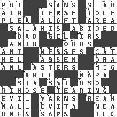 ACROSS 1. Plant holder 4. Without 8. Thick slice 12. Wind 13. Laconic 14. Lacquered or enameled metalware 15. Entreaty 17. At or to great height 18. Length times width 19. Deli grouping 21. Remained 23. Male parent 24. Set 26. Big collection agency 27. Among 28. Likelihood 30. Black tropical American cuckoo 31. Makes clutter 34. Domesticated feline 37. Cartoonist voice _ Blanc 38. NE Netherlands city 39. Mouth or opening 40. Leather borer 41. Michaelmas daisies 42. Russian fighter aircraft 43. Johnson of "Laugh-In" 44. California wine valley 46. R.R. building 47. Fast jet (abbr.) 50. Bear (Spanish) 51. Full of chinks, cracks, or crevices 54. Lacerating 57. Tending to cause great harm 58. Entertaining tales 60. 480, 500 or 516 sheets of paper 62. Shopping center 63. Webber/Rice musical 64. Teachers' org. 65. Washington bills 66. Plant excrements 67. Affectionate concern, for short DOWN 1. Infant food 2. Petroleums 3. Excercise machine 4. Former Milwaukee Brewers owner Bud 5. Came up 6. Science/research agcy. 7. Stalk of a moss capsule 8. Flight of steps 9. Nobles 10. Toward shelter 11. Necklace unit 13. Scottish cap 16. Jai ____ 20. Find the sum of 22. Auction offers 25. Failure 27. Afresh 29. Habitations of wild animals 30. Nursemaid (var.) 31. Vertical spar for supporting sails 32. _____ Park, CO 33. Compass dir. 34. Part 35. Operatic vocal solo 36. Label 41. Ancient river in northeast Turkey 43. Ringlike coral islands and reefs 44. And not 45. SW Saudi Arabia district 46. Grin 48. Empty completely 49. Portable shelters 51. San ____ (Riviera town) 52. "Terrible" tsar 53. Sight organs 55. White ___ sheet 56. Highlander 59. Actress Gardner 61. Apple computer (short form)