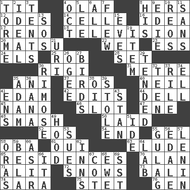 ACROSS 1. Teat (slang) 4. Norwegian king 8. Possessive pronoun 12. Lyric poems 14. Cell (Danish) 16. The main thing one is thinking about 17. Former U.S. Attorney General Janet 18. Household entertainment appliance 20. Taiwanese island in East China Sea 22. Soggy 23. Double-curved letter 24. Raised railways 25. Director Reiner 28. Arrange properly for use 30. Swiss mountan, "Queen of the Mountains" 31. Distance measurement (Brit.) 35. Cuckoo 37. Greek god of love 40. Famous astronaut Armstrong 41. Dutch treat 42. Prepares for publication 44. Small valley 45. Billionth: prefix 46. Slit 47. Compass dir. 48. Box-office sellout 50. Put down 52. Greek goddess of the dawn 54. Conclude 55. Set 58. Chief or king in Benin or Nigeria 61. Fr. "Yes" 63. Dodge 65. Dwellings 70. ____ Jay Lerner 71. Set down 72. Frozen precipitation (plural) 73. Indonesian resort city 74. "Two Mules for Sister ____" 75. Proofreading order 76. Commissioned mil. rank DOWN 1. Singer Mel 2. Perfect 3. Portable shelters 4. Sep. follower 5. Area sheltered from the wind 6. 100% 7. Soared 8. Part of HMS, perhaps 9. Singer Brickell 10. Vintage cars 11. Without 13. Distress signal 15. Nights before holidays 19. A distinct part 21. RI univ. 26. Double curve, resembling the letter S 27. Avian creatures 29. Looked after 30. Full of chinks, cracks, or crevices 32. Adolescent 33. Cause heat under the collar 34. Pipe bend 35. First of billions? 36. Nanny 38. Petroleum 39. Fur scarf 41. Followers of ems 43. Comedian Laurel of Laurel & Hardy 49. Parka part 51. Binary compound 53. Takes to court 55. POW camp 56. Peak District village in England 57. Soviet premier 1918-24 58. Mouths or openings 59. Actor Lugosi 60. SW Saudi Arabia district 62. Taverns 64. Experiment locale 66. Call ___ day 67. Small bed 68. She-sheep 69. Fast jet (abbr.)