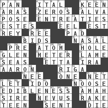 ACROSS 1. Baking dish 4. Slanted text style (abbr.) 8. Peachy ____! 12. Ancient river in northeast Turkey 14. Nothings 16. Inventor's middle name 17. Airs 18. Pleas 20. _____ Park, CO 22. Snakelike fish 23. Eastern Standard Time (abbr.) 24. Marina Del _, California 25. To riddle 28. Groovy apt. 30. Auction offers 31. Rhinal 35. Before (prefix) 37. Smallest unit of an element 40. Hollow 41. Small, secluded valley 42. Distance measurement 44. Unable to walk 45. Oceans 46. Singer James 47. Lyricist Gershwin 48. Composer Copland 50. Port city in Latvia 52. Born 54. Single 55. Fish or hair follower 58. Allow 61. Wedding promise 63. Trap for birds or small mammals 65. The property of being fit to eat 70. Wet nurse 71. The founder of a family 72. Mole, birthmark 73. Libertine 74. Adolescent 75. Transmitted 76. Expire DOWN 1. Some stationery 2. Came up 3. Difficult 4. Ending with capital 5. Nine, plus one 6. Nonscientific branch of learning 7. Old wives' tales, e.g. 8. Krazy ___ of comics 9. Writer Wiesel 10. Nights before holidays 11. Political cartoonist Thomas 13. Observe 15. Ooze 19. Actor Alda or Thicke 21. _ Lanka 26. Dutch treat 27. First name in cosmetics 29. A pale violet or amethyst color 30. Gillaume's butler role 32. Fly high 33. _ mater 34. Area sheltered from the wind 35. Entreaty 36. Rump 38. Baseball player Mel 39. Paris' subway 41. Girls' org. (abbr.) 43. Precipitation 49. Famous astronaut Armstrong 51. Commissioned mil. rank 53. Genesis locale 55. Wanderer 56. 1973 Nobel Price Winner (Physics) Leo 57. Giggle 58. For fear that 59. Singer Brickell 60. Hoop that covers a wheel 62. Singles 64. Boat paddle 66. Benjamin's nick name 67. First lady 68. Player for Phoenix 69. Fast jet (abbr.)