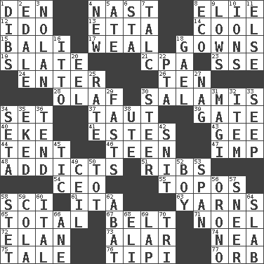 ACROSS 1. Lair 4. Political cartoonist Thomas 8. Writer Wiesel 12. Wedding promise 13. Singer James 14. Calm and collected 15. Indonesian resort city 17. Welt 18. Brides' dresses 19. Chalkboard 21. Accounting whiz (abbr.) 23. Compass dir. 24. Keyboard key 26. Nine, plus one 28. Norwegian king 30. Deli grouping 34. Arrange properly for use 37. Strained 39. Yard entry 40. Supplement with great effort 41. _____ Park, CO 43. Turn to the right 44. Portable shelter 46. Adolescent 47. Naughty child 48. Inveterate users 51. Teases 54. Corporate head (abbr.) 55. Literary convention 58. _-fi 61. Call ___ day 63. Entertaining tales 65. "_____ Recall" 67. Waist strap 71. Christmas carol 72. Flair 73. Having or resembling wings 74. Teachers' org. 75. Falsehood 76. Native american tent (variation) 77. Globe DOWN 1. Rights 2. Peak District village in England 3. Pitcher Ryan 4. ___ Haven, CT 5. Had dinner 6. R.R. building 7. Baby powder 8. Environmental prefix 9. Coldest temperatures 10. Charged atoms 11. Otherwise 16. "Tell ____ the Marines!" 18. Highlander 20. Snakelike fish 22. Parent Teacher Assoc. 25. Pace 27. Tired old horse 29. Goes without food and/or water 30. Guide 31. Wise men 32. Detail 33. Ooze 34. Stalk of a moss capsule 35. Made supply last 36. Be inclined (to) 38. Shoshoni 42. In a ____ (agitated or irritated) 45. Nervous spasm 49. To provide with a ceiling 50. Small child 52. Male child 53. Connect, as a bridge 56. U. of Maine site 57. Scornful expression 58. Proofreading order 59. Root beer relative 60. Slanted text style (abbr.) 62. Blind as ____ 64. Broad, flat, thick piece 66. A saturated hydrocarbon 68. Connecticut Ivy Leaguer 69. Infant locale 70. Three (prefix)