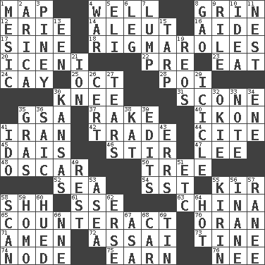 ACROSS 1. Atlas unit 4. Water source 8. Smile widely 12. 4th largest of the Great Lakes 14. Eskimo relative 16. Helper 17. Trig term 18. Frustrating wastes of time 20. Ancient Celtic tribe of eastern Britain 22. Before (prefix) 23. Erode 24. Island 25. Sep. follower 28. Luau course 30. Leg joint 31. Biscuitlike quick bread 35. Girls' org. (abbr.) 37. Immoral or dissolute person 40. Picture 41. SW Asia republic 42. Buy and sell 44. Quote 45. Raised platform 46. Agitate 47. Area sheltered from the wind 48. Witty Wilde 50. Woody plant 52. Ocean 54. Fast jet (abbr.) 55. Apertif with cassis 58. Quiet! 61. Compass dir. 63. Large country 65. Frustrate 70. Northwest Algerian city 71. So be it 72. Slender Brazilian palm 73. Prong on a fork 74. Thickened enlargement 75. Merit 76. Born DOWN 1. Mesonic 2. N. Chile seaport 3. Abounding in pines 4. Armed conflict 5. Biblical high priest 6. Part of a journey 7. Mass 8. E Mali city 9. Cause heat under the collar 10. The main thing one is thinking about 11. Egg locale 13. Car or cant ending 15. Canvas cover 19. Vintage cars 21. Electrically charged atom 26. An absolute certainty 27. Lacerates 29. Tapering mass of hanging ice 30. Sunflower state 32. Migrant worker of the '30s 33. Musical sound 34. Compass dir. 35. Pate de foie ____ 36. Ketch in the Levant 38. Krazy ___ of comics 39. Prepares for publication 41. Wedding promise 43. Blunders 49. Remainder 51. And so on (abbr.) 53. At sea 55. Japanese brewing company 56. Empty; void 57. Indian princess (variant) 58. Skim 59. Same (prefix) 60. Took on color 62. Celtic language 64. Being at a high temperature 66. Compass dir. 67. White ___ sheet 68. 4-wheeled motor vehicle 69. Metal container