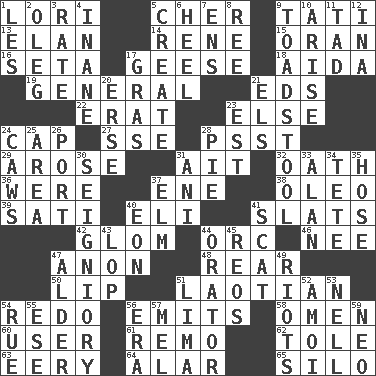 ACROSS 1. Australian parrot (variant) 5. "Mermaids" star 9. Jacques of French films 13. Style 14. French philosopher Descartes 15. NW Algerian seaport 16. Bristle 17. Honkers 18. Opera by Verdi 19. Commissioned military rank 21. Begley and Asner 22. Part of Q.E.F. 23. Otherwise 24. Head covering 27. Compass dir. 28. Inconspicuous attention getter 29. Came up 31. Small island 32. Pledge 36. We are 37. Compass dir. 38. Butter sub 39. Suttee (variant) 40. Connecticut Ivy Leaguer 41. Narrow boards 42. Take by theft 44. The grampus (Milton) 46. Born 47. At once, immediately (arch.) 48. Bring up, as a child 50. Mouth edge 51. Of or relating to Laos or its people 54. Make new 56. Sends forth 58. Presage 60. One who uses or employs something 61. San ____ (Riviera town) 62. Lacquered or enameled metalware 63. Suggestive of the supernatural 64. Having or resembling wings 65. Grain storage tower DOWN 1. French article 2. Cassini of fashion 3. Pace 4. Lacking in sense or substance 5. Cause to be 6. The bottom of a shoe or boot 7. Followers of ems 8. To sift 9. Inedible or poisonous agaric 10. Get up 11. Small amount or degree 12. _ tizzy (2 wds.) 17. Pate de foie ____ 20. Celtic language 21. Raised railways 23. Eastern Standard Time (abbr.) 24. Crow sounds 25. Type of rug 26. Sweet dark-red dessert wine 28. Sliced dessert 30. Signiory (variant) 31. Black tropical American cuckoo 33. ____ Jay Lerner 34. Wig 35. Flexible conduit 37. Shade tree 40. Age 41. Scram! 43. Chop off 44. Speaker 45. Vintage cars 47. Tree or shrub in the Birch family 49. Debaucheries 51. Pale green bean 52. Mine, in Marseilles 53. 1994 drama film starring Jodie Foster 54. Regret 55. Compass dir. 56. Epoch 57. Cartoonist voice _ Blanc 59. Modern: prefix