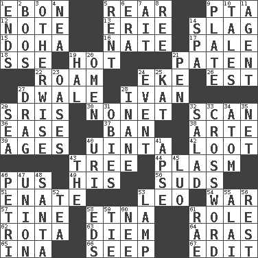 ACROSS 1. Inky black, to poets 5. Buttocks 9. Parent Teacher Association (abbr.) 12. Brief written record 13. One of the Great Lakes 14. Volcanic refuse 15. Capital of the state of Qatar 16. Nathan's nickname 17. Diluted with white 18. Compass dir. 19. Being at a high temperature 21. Eucharist need 22. Wander 24. Supplement with great effort 26. Eastern Standard Time (abbr.) 27. A sleeping potion; an opiate (poet.) 28. "Terrible" tsar 29. Indian titles of respect 30. Music written for nine 32. Examine hastily 36. Comfort 37. Bar 38. Johnson of "Laugh-In" 39. Eras 40. National forest in Provo, Utah 42. Spoils 43. Woody plant 44. Suffix with ecto or cyto 46. Ichor 49. Part of HMS, perhaps 50. Soap bubbles 51. Related on the mother's side 53. Lion 54. Armed conflict 57. Prong on a fork 58. Inactive volcano in Sicily 61. Hero or heavy, e.g. 62. Round or rotation of duties 63. South Vietnam president (1954) 64. Caspian sea tributary 65. _ tizzy (2 wds.) 66. Ooze 67. Prepare for publication DOWN 1. Extremities 2. Scornful sounds 3. Else 4. Teachers' org. 5. Monthly bill 6. Period 7. Small island 8. To riddle 9. Food holder 10. Lies 11. Rep 14. Health resort 19. Actor Linden 20. Presage 21. Writing instrument 23. Fertile tracts in a desert 24. Incident 25. Krazy ___ of comics 27. To draw with force 28. Silly 29. Ocean 31. Off-Broadway awards 32. Vegetable dish 33. What you're doing now 34. Tiny particle 35. Fish or hair follower 40. RI univ. 41. Domed church section 43. Definite Article 45. Nilotic language 46. _ dish (used to culture cells) 47. The state of being joined or united 48. Before Barbara or Clara 52. Beverage made from leaves 53. Desk light 55. Jai ____ 56. Relief 58. Begley and Asner 59. Neckwear 60. Born 61. Actress Charlotte