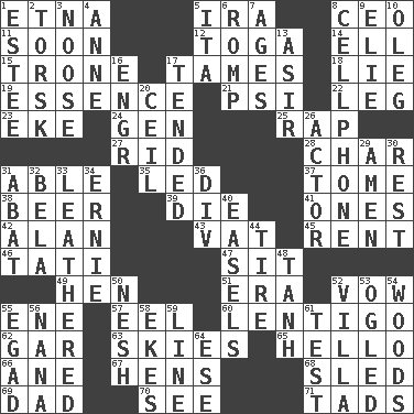 ACROSS 1. Inactive volcano in Sicily 5. Lyricist Gershwin 8. Corporate head (abbr.) 11. Within a short period 12. Ancient Roman robe 14. Pipe bend 15. Heavy duty weighing machine 17. Makes less strong or intense 18. Untruth 19. Substance 21. 23rd letter of the Greek alphabet 22. Part of a journey 23. Supplement with great effort 24. Commissioned military rank (abbr.) 25. Reproach for some lapse or misdeed 27. To free from 28. Burn to charcoal 31. Competent 35. Directed 37. Heavy book 38. Fermented drink made from hops 39. Expire 41. Washington bills 42. Actor Alda or Thicke 43. Large container 45. Monthly bill 46. Jacques of French films 47. Be seated 49. Layer 51. Period 52. Solemn pledge 55. Compass dir. 57. Snakelike fish 60. Small, flat, pigmented spot on the skin 62. Slender fish 63. Atmospheres 65. Phone greeting 66. A saturated hydrocarbon 67. Coop moms 68. Downhill vehicle 69. Male parent 70. Observe 71. Small amounts or degrees DOWN 1. First name in cosmetics 2. Cod relative 3. Trap for birds or small mammals 4. Singer Murray 5. Call ___ day 6. Play 7. Matures 8. Portable communications device 9. Writer Wiesel 10. Cassini of fashion 13. SW Saudi Arabia district 16. Engineer (abbr.) 17. Watched over 20. To provide with a ceiling 26. Thespian 29. So be it 30. Relief 31. Blind as ____ 32. Actor Lugosi 33. Resembling or made to resemble leather 34. Bert's buddy 36. HTML Container Element 40. Artist's stands 44. Hoop that covers a wheel 48. Hyperbolic tangent 50. Tender 52. Country residence 53. Stared 54. Forest 55. Mild oath 56. Nanny 58. Supplements with great effort 59. Actor's bit 61. Trial 64. Compass dir.
