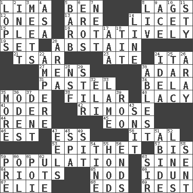 ACROSS 1. Pale green bean 5. Benjamin's nick name 8. Fails to keep up a pace 12. Washington bills 13. "We ___ not amused" (Victoria) 14. It is permitted: Lat. 15. Entreaty 16. Producing rotation 19. Arrange properly for use 20. Choose not to consume 21. Russian ruler of old 23. Had dinner 24. Call ___ day 27. Not women's 30. The sixth month of the Jewish calendar 31. Soft color 34. Actor Lugosi 35. Method 38. Of or pertaining to a thread or threads 40. Made of lace 41. River in Europe 42. Full of chinks, cracks, or crevices 44. French philosopher Descartes 45. Immeasurably long periods of time 46. Eastern Standard Time (abbr.) 47. Double-curved letter 50. Slanted text style (abbr.) 53. Curse 57. Altar cloth linen 59. Census information 63. Trig term 64. Disturbances 65. Allow head to fall sleepily 66. Goddess of spring and wife of Bragi 67. Writer Wiesel 68. Begley and Asner 69. Take ten DOWN 1. Chops off 2. An arm off of a larger body of water 3. Confronts 4. White ___ sheet 5. Sharp remark 6. Greek god of love 7. Remaining after all deductions 8. 54 in ancient Rome 9. Adept person 10. Set 11. Filthy place 14. Actor's bit 17. American Automobile Association (abbr.) 18. Teat (slang) 20. Type of rug 22. Electrical Unit 24. The main thing one is thinking about 25. Baby powder 26. Like ___ of sunshine 28. Overdraft (abbr.) 29. Tumult 30. Most capable 32. Biblical high priest 33. Unable to walk 35. Greater amount 36. Lyric poems 37. Scratch 39. Friend of Pooh 43. In a ____ (agitated or irritated) 47. Snakelike fish 48. Health resort 49. Be seated 51. Remain 52. "_ and Lucy" (Charlie Brown theme song) 54. Prong on a fork 55. Parka part 56. Conclusions 58. Emitted 59. Before (prefix) 60. Petroleum 61. Luau course 62. Shoshoni 63. Title for a knight