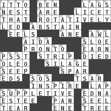 ACROSS 1. "Tell ____ the Marines!" 5. Benjamin's nick name 8. Straggles 12. Egg locale 13. "We ___ not amused" (Victoria) 14. It is permitted: Lat. 15. Not this but _ 16. Happening in regular succession 19. Directed 20. Choose not to consume 21. Snakelike fish 23. A saturated hydrocarbon 24. Leather borer 27. Opera by Verdi 30. _ gin 31. Right away 34. Merit 35. Inconspicuous attention getter 38. Remove all contents or possession from 40. Passed on 41. Margarine 42. Fodder prepared in a silo 44. Ooze 45. Coast Guard woman 46. Begley and Asner 47. Distress signal 50. Russian ruler of old 53. Heighten or intensify 57. Infant locale 59. Supplementary 63. Pulitzer Prize-winning author Ferber 64. First name in cosmetics 65. Baking dish 66. Stitch closed the eyes of (a falcon) 67. Pull into pieces 68. Compass dir. 69. Relationship diagram DOWN 1. International (abbr.) 2. Giggle 3. Sadhe (variant) 4. Baseball player Mel 5. Sharp remark 6. Greek god of love 7. Remaining after all deductions 8. 54 in ancient Rome 9. Adept person 10. Set 11. Filthy place 14. Actor's bit 17. American Automobile Association (abbr.) 18. Metal container 20. SW Saudi Arabia district 22. Portable computer 24. Jai _ 25. Had on 26. Grant temporary use of 28. Two (Sp.) 29. Pismires 30. Spring feasts 32. Three (prefix) 33. Lubricates 35. Airs 36. Downhill vehicle 37. Observes 39. Infant food 43. Yard entry 47. Filth; sediment 48. Single 49. Fast jet (abbr.) 51. Tree or shrub in the Birch family 52. Indian princess (variant) 54. Corncob 55. _ the terrible 56. French philosopher Descartes 58. Diluted with white 59. Arrange properly for use 60. Purpose 61. Parent Teacher Association (abbr.) 62. For each 63. Eastern Standard Time (abbr.)