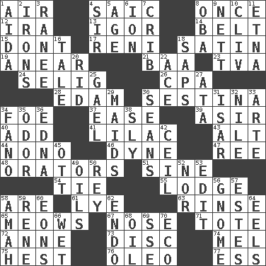 ACROSS 1. Wind 4. Ketch in the Levant 8. At one time in the past 12. Retirement account (abbr.) 13. Russian composer Stravinsky 14. Waist strap 15. Do not 17. Painter Guido (1575-1642) 18. Smooth fabric 19. Approach 21. Sound made by sheep 23. Federal power corp. 24. Major League Baseball Commissioner Bud 26. Numbers guy (abbr.) 28. Dutch treat 30. French poetic form 34. Enemy 37. Relaxation 39. SW Saudi Arabia district 40. Find the sum of 41. Pale purple color 43. Keyboard modifier key 44. Words to Nanette 46. Centimeter-gram-second unit of force 47. To riddle 48. Speakers 51. Trig term 54. Make a knot 55. Inn 58. "We ___ not amused" (Victoria) 61. Sodium hydroxide 63. Wash lightly 65. Catcalls? 67. Characteristic smell of wine 71. Haul 72. Singer Murray 73. Flat circle 74. Cartoonist voice _ Blanc 75. Behest 76. Butter sub 77. Double-curved letter DOWN 1. Opera by Verdi 2. Removes the wrinkles 3. Indian princess (variant) 4. Title for a knight 5. Mature 6. Electrically charged atom 7. Baby bed with high sides 8. Chief or king in Benin or Nigeria 9. Remaining after all deductions 10. 154 in Roman numerals 11. Inactive volcano in Sicily 16. Lie 18. Plant excrements 20. To free from 22. Adept person 25. Highlander 27. "One Day ___ Time" 29. Women servants 30. Seines 31. Austrian river, tributary to the Danube 32. Mediterranean tributary 33. Johnson of "Laugh-In" 34. Papal veil 35. Aroma 36. Pulitzer Prize-winning author Ferber 38. Wily 42. To provide with a ceiling 45. Baseball player Mel 49. Lubricates 50. Marina Del _, California 52. Or not 53. Prepare for publication 56. Dwarf 57. _____ Park, CO 58. Housemaid 59. French philosopher Descartes 60. Immeasurably long periods of time 62. Inside; within (prefix) 64. Snakelike fish 66. Soggy 68. Lubricate 69. Compass dir. 70. Environmental prefix