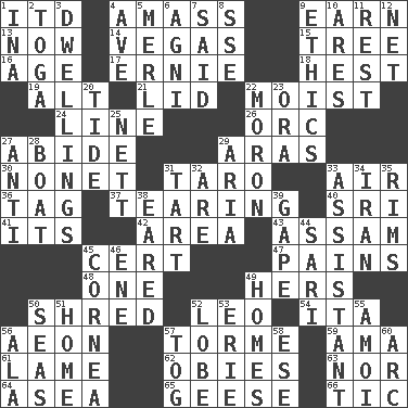 ACROSS 1. It would 4. Collect or gather 9. Merit 13. Immediately 14. Viva Las _ 15. Family _ (genealogy) 16. Grow older 17. Bert's buddy 18. Command 19. Keyboard modifier key 21. Hat (slang) 22. Damp 24. Actor's bit 26. The grampus (Milton) 27. Stay 29. Ancient river in northeast Turkey 30. Music written for nine 31. Edible starchy tuberous root 33. Atmosphere 36. Label 37. Separating forcefully 40. _ Lanka 41. ___ a Wonderful Life 42. Type of rug 43. Indian state 45. An absolute certainty 47. Aches 48. Single 49. Possessive pronoun 50. Fragment 52. Lion 54. Call ___ day 56. Period of immesurable duration 57. Singer Mel 59. Housemaid (var.) 61. Unable to walk 62. Off-Broadway awards 63. Or not 64. At sea 65. Honkers 66. Nervous spasm DOWN 1. _ tizzy (2 wds.) 2. Ancient Roman robe 3. Homes 4. "___ Maria" 5. Haggard of country music 6. Hindu god of fire 7. Expressed in words 8. Compass dir. 9. Moral principles 10. Ancient Greek god of war 11. State of inaction 12. Fish or hair follower 20. Periodic rise and fall of the sea level 22. Person of subnormal intelligence 23. Mouth or opening 25. Remaining after all deductions 27. Opposed to 28. Water vessel 29. Roberta Peters solo 31. Small pie 32. "We ___ not amused" (Victoria) 33. Aide 34. SW Asia republic 35. Basketball hoops 38. Having ears or earlike features 39. Stare wonderingly 44. Indian skirt 45. Pupil covering 46. Compass dir. 49. Residences 50. Oceans 51. Residence 52. Ear part 53. One of the Great Lakes 55. Mine, in Marseilles 56. In the manner of 57. Coat; cloak 58. Compass dir. 60. Curve
