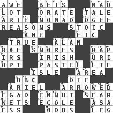 ACROSS 1. Deep reverence 4. Stakes 8. Impair 11. Car dealer's back yard 12. Speak pompously 14. Falsehood 15. Johnson of "Laugh-In" 17. Roamer 18. Double curve, resembling the letter S 19. Thinks logically 21. Unemotional 23. A saturated hydrocarbon 24. And so on (abbr.) 25. Loyal 27. ____ Jay Lerner 30. Actress Charlotte 31. Sounds asleep 34. Hit sharply and swiftly 37. Big collection agency 38. From or relating to Ireland 39. RI univ. 40. Choose 41. Soft color 43. Untruth 44. Capri or Wright 45. Type of rug 47. English channel? 49. Expire 50. Satellite of Uranus 52. Moved like an arrow 56. Mild oath 57. World-weariness 60. Dry up 61. Soaks 62. Learning spot: Fr. 63. White ___ sheet 64. Double-curved letter 65. Probability 66. Part of a journey DOWN 1. Having or resembling wings 2. Had on 3. Singer James 4. Child's nurse 5. Greek god of love 6. Scottish cap 7. R.R. building 8. Mysterious quality of enchantment 9. Actor Baldwin 10. To riddle 13. Begley and Asner 14. A blast of a horn 16. He sold his birthright 20. Washington bills 22. "___ Little Indians" 25. Canvas cover 26. Remainder 27. Originate 28. For fear that 29. American tennis player Robert 30. _ de Janeiro 32. Cuts off 33. Taken by mouth 34. Court order 35. Roberta Peters solo 36. Sliced dessert 42. Den 44. Frozen water 46. Vintage cars 47. Naughty children 48. Auction offers 49. Frees from moisture 50. Matures 51. Area sheltered from the wind 52. Old (Scot.) 53. Welt 54. Comfort 55. To draw with force 56. She-sheep 58. Non-commissioned officer (abbr.) 59. Lower and raise head in agreement