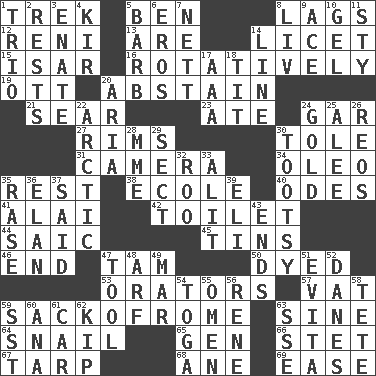 ACROSS 1. Long journey 5. Benjamin's nick name 8. Falls behind 12. Painter Guido (1575-1642) 13. "We ___ not amused" (Victoria) 14. It is permitted: Lat. 15. Austrian river, tributary to the Danube 16. Happening in regular succession 19. Baseball player Mel 20. Refrain by choice 21. Singe 23. Had dinner 24. Slender fish 27. Basketball hoops 30. Lacquered or enameled metalware 31. Device for capturing images 34. Butter sub 35. State of inaction 38. Learning spot: Fr. 40. Lyric poems 41. Jai _ 42. Bathroom 44. Ketch in the Levant 45. Metal containers 46. Conclusion 47. Scottish cap 50. Colored 53. Speakers 57. Large container 59. Italian handbag shop? 63. Trig term 64. Slow-paced one 65. Commissioned mil. rank 66. Proofreading order 67. Canvas cover 68. One (Scot) 69. Comfort DOWN 1. Musical group of three 2. Musical pauses 3. Maternal 4. Apertif with cassis 5. Sharp remark 6. Greek god of love 7. Remaining after all deductions 8. 54 in ancient Rome 9. Adept person 10. Set 11. Filthy place 14. Actor's bit 17. American Automobile Association (abbr.) 18. Teat (slang) 20. Operatic vocal solo 22. Northern region 24. Precious metal 25. Toward shelter 26. Vintage cars 28. Madame (abbr.) 29. Religious group 30. A girl or young woman (variant) 32. Friend of Pooh 33. Set down 35. To erase 36. Enthusiasm 37. Alleged 39. Biblical high priest 43. Extremities 47. Implement 48. Sandy's bark 49. Make imperfect 51. Webber/Rice musical 52. Natives or inhabitants of Denmark 54. Ancient Roman robe 55. Presage 56. French philosopher Descartes 58. False hair 59. Fast jet (abbr.) 60. Santa ___, CA 61. Auto 62. Sleep 63. Compass dir.