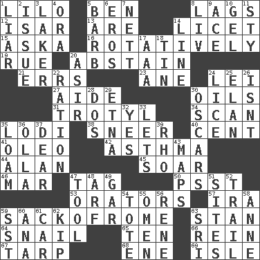 ACROSS 1. _ and Stitch 5. Benjamin's nick name 8. Falls behind 12. Austrian river, tributary to the Danube 13. "We ___ not amused" (Victoria) 14. It is permitted: Lat. 15. "____ silly question..." 16. Rotating or pertaining to rotation 19. Sorrow 20. Choose not to consume 21. Blunders 23. A saturated hydrocarbon 24. Luau accessory 27. Helper 30. Petroleums 31. Trinitrotoluene 34. Skim 35. Farming town in central California 38. Contemptuous expression 40. Penny 41. Margarine 42. Respiratory problem 44. ____ Jay Lerner 45. Fly high 46. Make imperfect 47. Label 50. Inconspicuous attention getter 53. Speakers 57. Retirement account (abbr.) 59. Italian handbag shop? 63. Comedian Laurel of Laurel & Hardy 64. Slow-paced one 65. Nine, plus one 66. It's straight from the horse's mouth 67. Canvas cover 68. Compass dir. 69. Capri or Wright DOWN 1. One who doesn't tell the truth 2. Come out of 3. Member of a famous L.A. basketball team 4. Mouth or opening 5. Sharp remark 6. Greek god of love 7. Remaining after all deductions 8. 54 in ancient Rome 9. Adept person 10. Set 11. Filthy place 14. Actor's bit 17. Auto club (abbr.) 18. Shallow baking pan 20. SW Saudi Arabia district 22. Food allowance for one day 24. Louse (plural) 25. Style 26. Is not 28. Two (Sp.) 29. Inactive volcano in Sicily 30. Motion picture awards 32. Consenting reply 33. Allows 35. Rich soil 36. Spanish pot 37. Letter starter 39. 17th letter of the Greek alphabet 43. Atlas contents 47. Instrument 48. Sandy's bark 49. Slender fish 51. Locates 52. Lag or linger behind 54. Carry 55. Sign of something about to happen 56. French philosopher Descartes 58. Singer Murray 59. Fast jet (abbr.) 60. Santa ___, CA 61. Automobile 62. Monetary unit of Laos 63. Indian title of respect (Mr.)