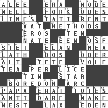 ACROSS 1. Toward shelter 5. Period 8. Method 12. Water source 13. Tined utensil 15. Lyric poems 16. Citrus fruits 18. Jacques of French films 19. Monthly bill 20. Large container 22. Modes 24. Greek god of love 26. Nine, plus one 27. Nathan's nickname 28. Car or cant ending 29. Order of Saint Francis (abbr.) 32. Proofreading order 35. Style 37. Teachers' org. 38. Thin strip of wood or metal 39. Two (Sp.) 40. Baltic tributary 41. Keyboard modifier key 42. False hair 43. Grand slam 44. Beverage made from leaves 45. For each 46. Louse (plural) 49. Shallow baking pan 50. Play the lead 51. Mood resulting from idleness 55. Curve 56. Dad 57. Part of Q.E.F. 59. Hauls 63. Against 64. Have the gumption 65. Create 66. A home for chicks 67. Not strict 68. Genesis locale DOWN 1. Leather borer 2. Flowery wreath 3. Shade tree 4. Veterans Day date 5. Newt 6. Wander 7. Johnson of "Laugh-In" 8. Person of subnormal intelligence 9. Wrote a lyric poem 10. Habitations of wild animals 11. Eastern Standard Time (abbr.) 14. Baby cat 17. "Two Mules for Sister ____" 21. Small child 23. Layer 25. Sowing specialist 28. Artist's stands 29. Southwest Nigerian state 30. Stitch closed the eyes of (a falcon) 31. Conductor's collection 32. Narrow board 33. Lie 34. Singer James 36. Car dealer's back yard 40. Conquer 42. Watched over 45. Sliced dessert 47. Call ___ day 48. Draw slowly or heavily 49. Distinguishing feature 51. Object of repulsion 52. Chooses 53. Taken by mouth 54. Hindu Mythology: god of death 56. Baking dish 58. John Ritter's dad 60. Bit 61. Make supply last 62. Elected rep.