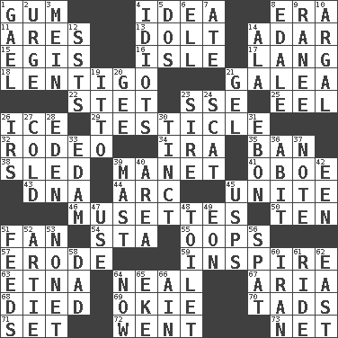 ACROSS 1. Chewing product 4. It may be bright or harebrained 8. Epoch 11. Ancient Greek god of war 13. Stupid person 14. The sixth month of the Jewish calendar 15. Armor plate that protects the chest 16. Capri or Wright 17. Austrian-born American filmmaker Fritz 18. Small, flat, pigmented spot on the skin 21. An organ shaped like a helmet 22. Proofreading order 23. Compass dir. 25. Snakelike fish 26. Frozen water 29. A testis 32. Cowboy competition 34. Lyricist Gershwin 35. Forbid 38. Downhill vehicle 39. French painter Edouard 41. Mitch Miller's instrument 43. Heredity factor (abbr.) 44. Curve 45. Join together 46. French bagpipes 50. Nine, plus one 51. Avid follower 54. R.R. building 55. I made a mistake 57. Eat (away) 59. Motivate 63. Inactive volcano in Sicily 64. Anneal 67. Roberta Peters solo 68. Passed on 69. Migrant worker of the '30s 70. Small boys 71. Put into a specified state 72. Left 73. Fish or hair follower DOWN 1. Highlander 2. Goad 3. Chow _ 4. Foolish or stupid persons 5. Two (Sp.) 6. Pipe bend 7. Had dinner 8. Peak District village in England 9. Indian princess (variant) 10. Therefore, facetiously 12. Fast planes 14. According to 19. "Tell ____ the Marines!" 20. Unit of force equal to gravity 21. Set 23. Title for a man of rank and authority 24. Scram! 26. Big collection agency 27. Lacking warmth 28. Locale of original sin 30. Colored lightly or faintly 31. Inky black, to poets 33. Dutch treat 36. "This won't hurt ____!" 37. Make mention of 39. Vertical spar for supporting sails 40. Length times width 42. Car or cant ending 45. United States Postal Service (abbr.) 47. Purpose 48. Bathroom plumbing fixture 49. Period of immesurable duration 51. Gives food to 52. Nick name for Arthur 53. Music written for nine 56. Petty quarrel 58. Male parent 60. SW Asia republic 61. Travel on or in a vehicle 62. Compass direction 64. At this time 65. Make supply last 66. The 18th letter of the Arabic alphabet