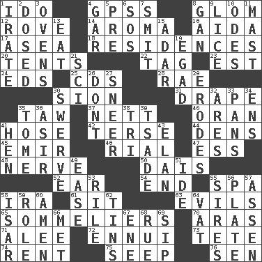 ACROSS 1. Wedding promise 4. Global Positioning Systems (abbr.) 8. Seize upon or latch onto something 12. Be footloose 14. Scent 16. Opera by Verdi 17. At sea 18. Dwellings 20. Portable shelters 22. Label 23. Eastern Standard Time (abbr.) 24. Begley and Asner 25. Music discs 28. Actress Charlotte 30. The Jewish people; Israel 31. Window treatment 35. The 23rd letter of the Hebrew alphabet 37. Remaining after all deductions 40. Northwest Algerian city 41. Flexible conduit 42. Laconic 44. Lairs 45. Arab leader 46. Monetary unit of Yemen 47. Double-curved letter 48. Boldness 50. Raised platform 52. Ewer handle 54. Conclude 55. Health resort 58. Lyricist Gershwin 61. Be seated 63. Vices 65. Wine waiters 70. Caspian sea tributary 71. Toward shelter 72. World-weariness 73. False hair 74. Monthly bill 75. Ooze 76. Elected rep. DOWN 1. Feeling or showing extreme anger 2. Administered medicine 3. Baking chambers 4. Slender fish 5. Before (prefix) 6. Distress signal 7. Stricken, poetically 8. Separate the seeds from cotton 9. Louse (plural) 10. Lyric poems 11. Vertical spar for supporting sails 13. Ingest 15. The sixth month of the Jewish calendar 19. Mild oath 21. _-fi 26. Do not 27. Scornful expression 29. Eats (away) 30. Turn aside suddenly 32. Ancient Greek god of war 33. Baking dishes 34. Followers of ems 35. Heavy book 36. SW Saudi Arabia district 38. Three (prefix) 39. Sadhe (variant) 41. Layer 43. Style 49. Comfort 51. Binary compound 53. Cause heat under the collar 55. Founders of families 56. Food holder 57. NE Netherlands city 58. Austrian river, tributary to the Danube 59. Hero or heavy, e.g. 60. So be it 62. Canisters 64. Large container 66. Was introduced to 67. Compass dir. 68. Sorrow 69. Small drink