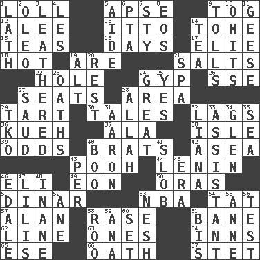 ACROSS 1. Hang loosely or laxly 5. Domed church section 9. Coat; cloak 12. Toward shelter 13. "Tell ____ the Marines!" 14. Heavy book 15. Beverages made from leaves 16. 24-hour periods 17. Writer Wiesel 18. Being at a high temperature 19. "We ___ not amused" (Victoria) 21. Table seasonings 22. Opening into or through something 24. Flimflam 26. Compass dir. 27. Theater features 28. Type of rug 29. Small pie 30. Stories 32. Fails to keep up a pace 36. Malaysian steamed pastry 37. Wing 38. Small island 39. Probability 40. Naughty children 42. At sea 43. "Silly old bear" 44. Soviet premier 1918-24 46. Biblical high priest 49. Age 50. Mouths or openings 51. Middle Eastern gold or silver currency 53. Basketball assoc. 54. Make lace 57. ____ Jay Lerner 58. Raze (variant) 61. Object of repulsion 62. Actor's bit 63. Washington bills 64. Lodging establishments 65. Compass dir. 66. Pledge 67. Proofreading order DOWN 1. Thin strip of wood or metal 2. Butter sub 3. Resembling or made to resemble leather 4. French article 5. Assistant 6. Parent Teacher Association (abbr.) 7. Filthy place 8. Greek goddess of the dawn 9. For Whom the Bell _____ 10. Leaves out 11. Honkers 14. Beverage made from leaves 19. Keyboard modifier key 20. Take ten 21. Health resort 23. Profane or obscene expressions 24. Relatively large 25. Affirmative reply 27. Saudi Arabian king (1953-1964) 28. Assad's deity 29. Ring climax 31. Composer Copland 32. Woody, climbing, usually tropical plant 33. Helper 34. Small, secluded valley 35. Ocean 40. Sometimes accompanies a hiss 41. Oscar Madison type 43. For each 45. Period 46. Peak District village in England 47. Ms. Damita and namesakes 48. Silly 52. A saturated hydrocarbon 53. Delicate 55. Singer Murray 56. Trial 58. Friend of Pooh 59. Santa ___, CA 60. Put into a specified state 61. Again