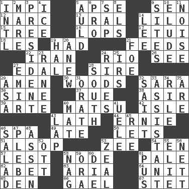 ACROSS 1. Body of Kaffir warriors 5. Domed church section 9. Elected rep. 12. Drug cop 13. Mountain range 14. _ and Stitch 15. Family _ (genealogy) 16. Chops off 17. Needle holder 18. French article 19. Possessed 21. Gives food to 22. SW Asia republic 24. River (Sp.) 26. Observe 27. Peak District village in England 28. The founder of a family 29. So be it 30. Forest 32. "Two Mules for Sister ____" 36. Trig term 37. Regret 38. SW Saudi Arabia district 39. Johnson of "Laugh-In" 40. Taiwanese island in East China Sea 42. Capri or Wright 43. Thin strip of wood or metal 44. Bert's buddy 46. Health resort 49. Had dinner 50. Allows 51. Columnist Joseph or Stewart 53. Last letter of the English alphabet 54. Nine, plus one 57. For fear that 58. Connecting point 61. Light colored 62. Collude with 63. Operatic vocal solo 64. A single undivided whole 65. Lair 66. Highlander 67. Proofreading order DOWN 1. International (abbr.) 2. Female horse 3. Elected leader of a country 4. Frozen water 5. Old (Scot.) 6. Adept person 7. Plant excrement 8. Raised railways 9. Locates 10. Dodge 11. Annoying sound 14. Area sheltered from the wind 19. Actor Linden 20. Afresh 21. Enemy 23. Indian princess (variant) 24. Amusement-park features 25. Big collection agency 27. Independent ruler or chieftain 28. Compass direction 29. White ___ sheet 31. Declaim 32. Virtuous person 33. Aide 34. Cause heat under the collar 35. "We ___ not amused" (Victoria) 40. Floor protector 41. Ubangi River tributary 43. Infant locale 45. To riddle 46. Vegetable dish 47. Military trainee 48. NE Netherlands city 52. Baseball player Mel 53. Ardor 55. Writer Wiesel 56. Remaining after all deductions 58. Tired old horse 59. Mouth or opening 60. Pass on 61. Suppuration