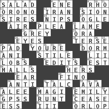 ACROSS 1. Vegetable dish 6. Compass dir. 9. 17th letter of the Greek alphabet 12. U. of Maine site 13. SW Asia republic 14. The Jewish people; Israel 15. Titles for men of rank and authority 16. Pinches, bites 17. Stare at amorously 18. Wind 19. Entreaty 20. Unable to walk 21. Jennifer or Joel 23. Mouth or opening 24. Snake ____ (dice throw) 25. Laconic 28. Groovy apt. 30. You are 34. Dormintory (informal) 35. Cuckoo 36. Vertical member of a panel or frame 38. Cards in a Roman deck? 39. Tennis shots 41. Proofreads 43. Eastern Standard Time (abbr.) 44. Promenades 46. Possessive pronoun 48. Ewer handle 49. A pale, very dry sherry 50. Opposed to 51. Baby powder 53. Actress Gardner 56. Toward shelter 57. Wise men 58. Poet Dickinson 60. Global Positioning Systems (abbr.) 61. The smallest animal of a litter 62. Desist 63. Double-curved letter 64. One more than two 65. Lowest deck of a ship DOWN 1. Distress signal 2. Operatic vocal solo 3. Australian parrot (variant) 4. Disorder of the immune system 5. Two (Sp.) 6. 4th largest of the Great Lakes 7. California wine valley 8. Followers of ems 9. Complicated, petty procedures 10. Opening into or through something 11. Single 13. Inwardly 14. Flew 19. Mexican monetary units 20. Car dealer's back yard 22. Marina Del _, California 24. The property of being fit to eat 26. Indian titles of respect 27. Send forth 28. Inside of hand 29. Small Philippine buffalo 31. Shoshoni 32. To free from 33. Biblical high priest 37. Value system 40. Chalkboards 42. Elected rep. 45. Indian title of respect (Mr.) 47. Wanderer 49. Secret move to avoid paying debts 50. High mountains 51. "Change" in Tahitian 52. Hindu god of fire 54. Small bottle 55. In addition 56. Grow older 57. Medical imaging device (abbr.) 58. Environmental prefix 59. Slangy assent