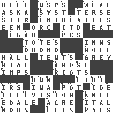 ACROSS 1. Coral collection 5. United States Postal Service (abbr.) 9. Welt 13. "____ silly question..." 14. System (abbr.) 15. Laconic 16. Disorderly outburst 17. Pleas 19. Car or cant ending 20. The grampus (Milton) 21. It would 22. Consume 23. Mild oath 25. Personal Computers (abbr.) 26. Hauls 30. Lodging establishments 34. U. of Maine site 35. Christmas carol 36. Shopping center 39. Portable shelters 42. Jennifer or Joel 43. Monetary unit of Yemen 44. Came up 46. Naughty children 47. Debaucheries 48. Attila the _ 51. Needle case 54. Big collection agency 57. _ tizzy (2 wds.) 58. Cooking vessel 60. Binary compound 62. Household entertainment appliance 65. Leg joint 66. Peak District village in England 67. Land measure 68. Slanted text style (abbr.) 69. Disorderly crowds 70. Allows 71. Friends DOWN 1. Raze (variant) 2. First name in cosmetics 3. Supplementing with great effort 4. Distant 5. One who uses or employs something 6. Synchronize (abbr.) 7. Pacific Standard Time (abbr.) 8. Remove all contents or possession from 9. Dripping 10. 4th largest of the Great Lakes 11. Toward the sea 12. For fear that 15. Bits 18. And so on (abbr.) 20. Aroma 24. Ringlike coral islands and reefs 27. Small child 28. Compass dir. 29. Echolocation 30. Eat 31. Not either 32. Born 33. Cunning 36. Medical imaging device (abbr.) 37. Direct toward a target or goal 38. Infant locale 40. Three (prefix) 41. "Barney Miller" actor Jack 45. Proofreading order 48. Hub of activity 49. University (slang) 50. Relating to the nose 52. National forest in Provo, Utah 53. Perfect 54. Detail 55. Redecorate 56. Broad, flat, thick piece 58. Sweet dark-red dessert wine 59. Washington bills 61. Snakelike fish 63. Raised railways 64. Frozen water 65. Sleep