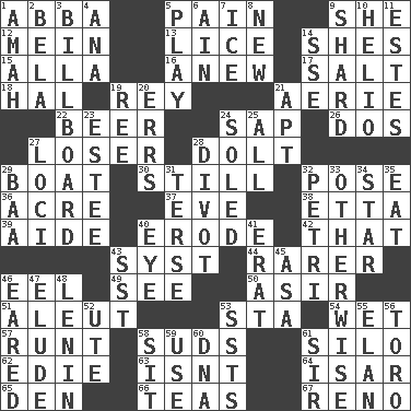 ACROSS 1. Swedish rock group 5. Ache 9. A female animal or person 12. Count _ (2 wds.) 13. Louse (plural) 14. "______ My Girl" (Turtles hit) 15. Silent film actress Nazimova 16. Afresh 17. Table seasoning 18. Actor Linden 19. Marina Del _, California 21. Nest on high 22. Fermented drink made from hops 24. Plant excrement 26. Two (Sp.) 27. Failure 28. Stupid person 29. Water vessel 30. Free of sound 32. Airs 36. 1/640 square mile 37. First lady 38. Singer James 39. Assistant 40. Wear away 42. Not this but _ 43. System (abbr.) 44. Less widely known 46. Snakelike fish 49. Observe 50. SW Saudi Arabia district 51. Eskimo relative 53. R.R. building 54. Soggy 57. Undersized animal 58. Beer foam 61. Grain storage tower 62. Singer Brickell 63. Is not 64. Austrian river, tributary to the Danube 65. Lair 66. Beverages made from leaves 67. Former U.S. Attorney General Janet DOWN 1. Nanny 2. Actor Lugosi 3. Big road sign 4. Santa ___, CA 5. Shaw product 6. The 18th letter of the Arabic alphabet 7. Frozen water 8. ___ Haven, CT 9. Broken piece 10. Sun: prefix 11. _____ Park, CO 14. Compass dir. 19. To riddle 20. Blunders 21. Fitting 23. First name in cosmetics 24. Having a sole or soles 25. Everything 27. Venues 28. A piece of turf (Scot.) 29. Sound made by sheep 31. Laconic 32. _ dish (used to culture cells) 33. Else 34. Play the lead 35. Consume 40. Sight organ 41. Part of Q.E.F. 43. Fast jet (abbr.) 45. White ___ sheet 46. Having ears or earlike features 47. Dodge 48. Soviet premier 1918-24 52. Shoshoni 53. Fast planes 55. Enthusiasm 56. "Corrida" creature 58. Be seated 59. Purpose 60. Heredity factor (abbr.) 61. Title for a knight