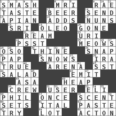ACROSS 1. Box-office sellout 6. Medical imaging device (abbr.) 9. Actress Charlotte 12. Clothes sense 13. Fermented drink made from hops 14. Post 15. Bee-related 16. Sums up 17. Religious women 18. Indian title of respect (Mr.) 19. Butter sub 20. Went 21. 480, 500 or 516 sheets of paper 23. RI univ. 24. Inconspicuous attention getter 25. Catcalls? 28. Bear (Spanish) 30. One or ones belonging to thee 34. Fastener 35. Infant food 36. Overwhelms 38. Lyricist Gershwin 39. Loyal 41. Sports stadium 43. Fast jet (abbr.) 44. Vegetable dish 46. Give off 48. White ___ sheet 49. Pile 50. Ship's personnel 51. One who makes use of a thing 53. Biblical high priest 56. Silvers or Donahue 57. Single time 58. Odor 60. Puts into a specified state 61. Slanted text style (abbr.) 62. Thick mixture 63. Attempt to accomplish something 64. Car dealer's back yard 65. Gambison DOWN 1. R.R. building 2. Atlas contents 3. SW Saudi Arabia district 4. Flight of steps 5. Layer 6. Ancient Persian 7. Do over again 8. Big collection agency 9. One who advocates reunion 10. Queen of England 1702-14 11. Begley and Asner 13. Lip ointment 14. Sounds asleep 19. Profane or obscene expressions 20. Chewing product 22. Eastern Standard Time (abbr.) 24. Teen's desire 26. Armed conflicts 27. Argument over a trivial matter 28. Chooses 29. "Two Mules for Sister ____" 31. _ tizzy (2 wds.) 32. Not either 33. She-sheep 37. Scornful expression 40. Artist's stands 42. Housemaid (var.) 45. Fool 47. Medicinal drug used to evoke vomiting 49. The bottom of a shoe or boot 50. "Mermaids" star 51. To (old English) 52. Scram! 54. For fear that 55. To the inside or interior of 56. Pacific Standard Time (abbr.) 57. Lubricate 58. Health resort 59. Nine, plus one
