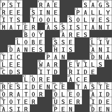 ACROSS 1. Pacific Standard Time (abbr.) 4. Actress Charlotte 7. Sinks 11. To separate or throw off 12. Trig term 13. Chummy 14. It is 15. Instrument 16. Finds the solution 17. Mother 19. Aide 21. Male child 23. Ancient Greek god of war 24. Ear part 25. Compass dir. 26. 54 in ancient Rome 29. Natives or inhabitants of Denmark 30. Part of HMS, perhaps 31. Cuckoo 32. Nervous spasm 33. Baking dish 34. Heredity factor (abbr.) 35. Area sheltered from the wind 36. Armed conflict 37. Vices 40. Music discs 41. It would 42. Travel on an animal 43. Old wives' tales, e.g. 45. Adept person 46. Home 51. Clothes sense 55. Speaker 56. Margarine 58. Help 59. Carrier 60. One who uses or employs something 61. Binary compound 62. SW Saudi Arabia district 63. Animal enclosure 64. Lair DOWN 1. Demure 2. Stalk of a moss capsule 3. Trial 4. _ de Janeiro 5. Small Philippine buffalo 6. Snakelike fish 7. Table seasonings 8. Inventor's middle name 9. Small, secluded valley 10. System (abbr.) 12. Disco prop 13. Introduce or present, as a question 16. Titles for men of rank and authority 18. Inky black, to poets 20. Indian antelope 22. Consenting reply 24. Shoestrings 25. Broken piece 26. Dipping utensil 27. Taverns 28. By way of 29. Passed on 32. Affectionate concern, for short 33. Eucharist need 36. One who wires 37. Period 38. Winning man's name 39. The main thing one is thinking about 43. 61 cubic inches 44. Aroma 46. Round or rotation of duties 47. Greek god of love 48. Suttee (variant) 49. Overturn; upset 50. Otherwise 52. Alleged 53. Event that recurs at intervals 54. Paradise 57. Car or cant ending
