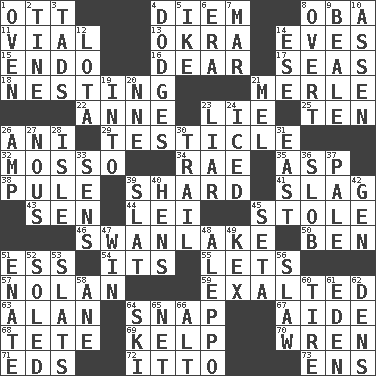 ACROSS 1. Baseball player Mel 4. South Vietnam president (1954) 8. Chief or king in Benin or Nigeria 11. Small bottle 13. Gumbo ingredient 14. Nights before holidays 15. Inside; within (prefix) 16. Letter starter 17. Oceans 18. Snuggling 21. Haggard of country music 22. Singer Murray 23. Falsehood 25. "___ Little Indians" 26. Cuckoo 29. A testis 32. With motion or animation 34. Actress Charlotte 35. Viper 38. Whimper 39. Broken piece 41. Volcanic refuse 43. Elected rep. 44. Luau accessory 45. Fur scarf 46. Tchaikovsky ballet 50. Benjamin's nick name 51. Curvy letter 54. ___ a Wonderful Life 55. Allows 57. Pitcher Ryan 59. Glorified 63. Actor Alda or Thicke 64. Fastener 67. Assistant 68. Wig 69. Seaweed 70. Songbird 71. Begley and Asner 72. "Tell ____ the Marines!" 73. Followers of ems DOWN 1. Baking chamber 2. Prong on a fork 3. Small boys 4. Evades 5. Mamie's husband 6. Period 7. Impair 8. Unconcealed 9. Calif. Air Force Base 10. NE Netherlands city 12. Globular water bottle used in Asia 14. Compass dir. 19. To the inside or interior of 20. Compass dir. 21. Cartoonist voice _ Blanc 23. One who doesn't tell the truth 24. On the rocks 26. Electrical Unit 27. Common sense 28. Capri or Wright 30. Hang back 31. Compass direction 33. Elected reps. 36. Oscar Madison type 37. Diluted with white 39. Narrow board 40. Coop moms 42. Commissioned mil. rank 45. Bristle 47. Victory 48. City in Syria 49. Dry husk or covering 51. Related on the mother's side 52. Having a sole or soles 53. Narrow boards 56. Cole _ (cabbage dish) 58. One (Scot) 60. Become fatigued 61. Genesis locale 62. Cub Scout units 64. What Jean-Claude Killy likes to do 65. Fish or hair follower 66. Keyboard modifier key