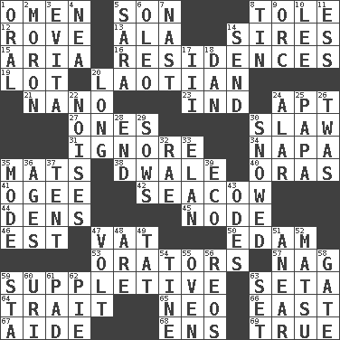 ACROSS 1. Presage 5. Manchild 8. Lacquered or enameled metalware 12. Be footloose 13. Wing 14. Titles for men of rank and authority 15. Roberta Peters solo 16. Dwellings 19. Car dealer's back yard 20. Of or relating to Laos or its people 21. Billionth: prefix 23. Indiana (abbr.) 24. Fitting 27. Singles 30. Cole _ (cabbage dish) 31. Dismiss 34. California wine valley 35. Floor coverings 38. A sleeping potion; an opiate (poet.) 40. Mouths or openings 41. Double curve, resembling the letter S 42. Manatee 44. Habitations of wild animals 45. Connecting point 46. Eastern Standard Time (abbr.) 47. Large container 50. Dutch treat 53. Speakers 57. Tired old horse 59. Supplying deficiencies 63. Stalk of a moss capsule 64. Distinguishing feature 65. Modern: prefix 66. 90 degrees 67. Helper 68. Followers of ems 69. Loyal DOWN 1. Spoken 2. Person of subnormal intelligence 3. Webber/Rice musical 4. Teachers' org. 5. "Two Mules for Sister ____" 6. Butter sub 7. Political cartoonist Thomas 8. Metal container 9. The grampus (Milton) 10. Area sheltered from the wind 11. Double-curved letter 14. Post 17. One more than two 18. Daniel's nick name 20. Protracted 22. Annoying sounds 24. Having or resembling wings 25. Dad 26. It was, poetically 28. Conclusion 29. Sty mamas 30. Overwhelmed 32. Actress Charlotte 33. Style 35. Method 36. Eras 37. Portable shelter 39. Environmental prefix 43. Lyric poems 47. Electrical Unit 48. "We ___ not amused" (Victoria) 49. Make lace 51. Approach 52. Taiwanese island in East China Sea 54. Prong on a fork 55. Baking chamber 56. Vintage cars 58. Yard entry 59. R.R. building 60. RI univ. 61. Writing tablet 62. Sliced dessert 63. Arrange properly for use