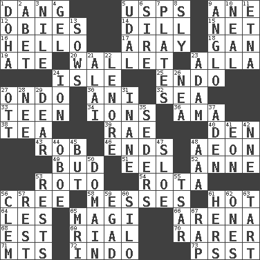 ACROSS 1. Mild oath, euphamism for damn 5. United States Postal Service (abbr.) 9. One (Scot) 12. Off-Broadway awards 14. Deli pickle 15. Fish or hair follower 16. Phone greeting 17. Like ___ of sunshine 18. Separate the seeds from cotton 19. Had dinner 20. Place for singles 23. Silent film actress Nazimova 24. Small island 25. Inside; within (prefix) 27. Southwest Nigerian state 30. Cuckoo 32. Ocean 33. Adolescent 34. Charged particles 36. Housemaid (var.) 38. Afternoon social gathering 39. Actress Charlotte 40. Lair 43. Director Reiner 46. Extremities 48. Period of immesurable duration 49. Partially opened flower 51. Snakelike fish 52. Singer Murray 53. Printing process, for short 54. Roll call or roster of names 56. Algonquian 58. Makes clutter 61. Being at a high temperature 64. French article 65. Wise men 66. Sports stadium 68. Eastern Standard Time (abbr.) 69. Monetary unit of Yemen 70. More valued for its uncommonness 71. Mountains (abbr.) 72. Southeast Asian peninsula 73. Inconspicuous attention getter DOWN 1. Capital of the state of Qatar 2. Collude with 3. "Death on the ____" 4. Set 5. Freehold land 6. Male parent of an animal 7. Food holders 8. Cunning 9. White American of non-Hispanic descent 10. Anneal 11. Inactive volcano in Sicily 13. Sty mamas 21. Jai _ 22. Poe poem 23. First of billions? 24. Electrically charged atom 26. Teachers' org. 27. Baseball player Mel 28. Born 29. Letter starter 31. Empty; void 35. Spring feasts 37. An important port of Yemen 41. Period of immesurable duration 42. Compass dir. 44. Mitch Miller's instrument 45. Yet 47. _ gin 48. American Automobile Association (abbr.) 50. Realm 53. Musical pauses 55. Russian ruler of old 56. To starve (Brit.) 57. Take ten 59. Mild oath 60. Grain storage tower 61. Possessive pronoun 62. Singles 63. Small pie 65. Medical imaging device (abbr.) 67. Hit sharply and swiftly