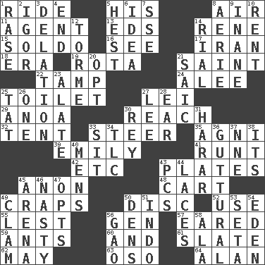 ACROSS 1. Travel on or in a vehicle 5. Part of HMS, perhaps 8. Wind 11. Rep 13. Begley and Asner 14. French philosopher Descartes 15. Twentieth part of a lira 16. Perceive with the eye 17. SW Asia republic 18. Epoch 19. Roll call or roster of names 21. Inhabitant of Heaven 22. Pack (down) 24. Toward shelter 25. Bathroom plumbing fixture 27. Luau accessory 29. Small Philippine buffalo 30. Arrive at 32. Portable shelter 33. Guide 35. Hindu god of fire 39. Poet Dickinson 41. The smallest animal of a litter 42. And so on (abbr.) 43. Food holders 45. Soon (poet.) 48. Haul 49. Dice game 50. Flat circle 52. Purpose 55. For fear that 56. Commissioned mil. rank 57. Having ears or earlike features 59. Pismires 60. Plus 61. Schedule 62. Fifth month 63. Bear (Spanish) 64. ____ Jay Lerner DOWN 1. Raze (variant) 2. Russian composer Stravinsky 3. Accusation by an informer 4. Conclude 5. Command 6. The content of cognition 7. Compass dir. 8. Nest on high 9. Silly 10. Monthly bill 12. Singer Mel 14. Monetary unit of Yemen 20. Elect 21. Ketch in the Levant 23. Having winglike extensions 25. Make lace 26. Single 27. Area sheltered from the wind 28. Ewer handle 30. Marina Del _, California 31. Ethiopian city, capital of Harari 33. Be seated 34. Affectionate concern, for short 36. From the throat 37. Compass dir. 38. It is 40. Not women's 43. Personal Computers (abbr.) 44. Shoestrings 45. Sports stadium 46. Characterized by obscenity 47. Chooses 49. Dollar (slang) 50. Lairs 51. Southeast Asian peninsula 53. Stalk of a moss capsule 54. Locale of original sin 56. E Mali city 58. In the manner of
