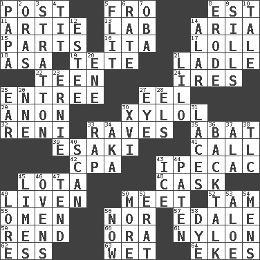 ACROSS 1. Mail 5. Back 8. Eastern Standard Time (abbr.) 11. Nick name for Arthur 13. Experiment locale 14. Operatic vocal solo 15. Actors' quests 16. Call ___ day 17. Hang loosely or laxly 18. White ___ sheet 19. Wig 21. Dipping utensil 22. Adolescent 24. Angers 25. Main course 27. Snakelike fish 29. Soon (poet.) 30. Xylene (variant) 32. Painter Guido (1575-1642) 33. All-night dance parties 35. Blind as ____ 39. 1973 Nobel Price Winner (Physics) Leo 41. Give a ring to 42. Numbers guy (abbr.) 43. Medicinal drug used to evoke vomiting 45. Globular water bottle used in Asia 48. Keg 49. Make or become more lively 50. Rendezvous 52. Scottish cap 55. Sign of something about to happen 56. Not either 57. Peak District village in England 59. Tear apart 60. Mouth or opening 61. High-strength synthetic material 62. Curvy letter 63. Soggy 64. Supplements with great effort DOWN 1. Dad 2. Mouths or openings 3. Ski resort town in Vermont 4. Teat (slang) 5. Secret move to avoid paying debts 6. Assign a rank or rating to 7. Chief or king in Benin or Nigeria 8. Eat (away) 9. Beverly of Met fame 10. Story 12. First name in cosmetics 14. Having or resembling wings 20. Compass dir. 21. _ and Stitch 23. Bert's buddy 25. Ewer handle 26. Compass dir. 27. Sight organ 28. Raised railways 30. 16 31. Shoestrings 33. Strike 34. Alias (abbr.) 36. Sass 37. In the manner of 38. Affectionate concern, for short 40. Examine hastily 43. Frozen water 44. Eucharist need 45. Citrus fruits 46. Baking chambers 47. Look after 49. Old wives' tales, e.g. 50. Greater amount 51. Part of Q.E.F. 53. _ vera 54. Not women's 56. At this time 58. Color