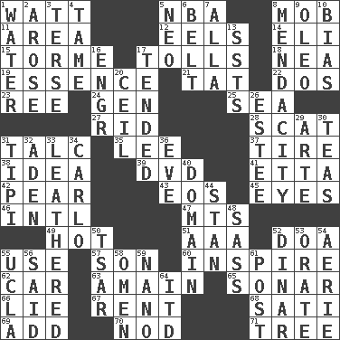 ACROSS 1. Electrical Unit 5. Basketball assoc. 8. Disorderly crowd 11. Length times width 12. Snakelike fish 14. Biblical high priest 15. Singer Mel 17. For Whom the Bell _____ 18. Teachers' org. 19. Core 21. Make lace 22. Two (Sp.) 23. To sift 24. Commissioned military rank (abbr.) 25. Ocean 27. To free from 28. Leave at once 31. Baby powder 35. Area sheltered from the wind 37. Hoop that covers a wheel 38. It may be bright or harebrained 39. Movie disc 41. Singer James 42. Lightbulb-shaped fruit 43. Greek goddess of the dawn 45. Snake ____ (dice throw) 46. International (abbr.) 47. Mountains (abbr.) 49. Being at a high temperature 51. American Automobile Association (abbr.) 52. ___ good deed 55. Purpose 57. Male offspring 60. Heighten or intensify 62. Auto 63. With great haste 65. Echolocation 66. Whopper 67. Monthly bill 68. Suttee (variant) 69. Say or write further 70. Lower and raise head in agreement 71. Relationship diagram DOWN 1. Wetness 2. Came up 3. Laconic 4. Docile 5. Modern: prefix 6. Waist strap 7. Silent film actress Nazimova 8. Ananias' fault 9. Butter sub 10. Prejudice 13. Fast planes 16. Engineer (abbr.) 17. Watched over 20. To provide with a ceiling 26. First name in cosmetics 29. Johnson of "Laugh-In" 30. Afternoon social gatherings 31. Native american tent (variation) 32. Arabian gulf 33. Resembling or made to resemble leather 34. Monte _, Las Vegas Hotel/Casino 36. Night before a holiday 40. Realm 44. Comedian Laurel of Laurel & Hardy 48. Backtalk 50. Russian ruler of old 52. Middle Eastern gold or silver currency 53. Declaim 54. Nest on high 55. Southern CA. univ. 56. Alleged 58. Sign of something about to happen 59. Billionth: prefix 61. Mail 64. It would