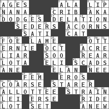 ACROSS 1. Eras 5. In the manner of 8. Mouth edge 11. Nanny 12. Baby bed with high sides 13. Alias (abbr.) 14. Evades 17. Conveyance 19. Spring feasts 21. Oak nuts 22. Suttee (variant) 23. Domesticated feline 24. Enemy 27. Unable to walk 29. Baseball player Mel 32. Bert's buddy 34. Sep. follower 36. Measure of real estate 37. One who doesn't tell the truth 38. "Barney Miller" actor Jack 39. Hitchcock's "____ Window" 40. Globular water bottle used in Asia 41. Biblical high priest 42. Tons 43. A saturated hydrocarbon 44. Liveliness 46. Born 47. Opposite of masc. 50. Greek god of love 52. Unrefined 55. A viewer who gazes fixedly 57. One to whom something is allotted 59. Put through a sieve 62. Flowery wreath 63. Celtic language 64. Travel on or in a vehicle 65. Car dealer's back yard 66. Put into a specified state 67. Afresh DOWN 1. Added to 2. E Mali city 3. Conclusions 4. Gurus 5. "We ___ not amused" (Victoria) 6. Pale purple color 7. Phillipine bananalike plant 8. Den 9. Picture 10. Baking dishes 12. Music discs 15. Peak District village in England 16. Stalk of a moss capsule 18. Small child 20. Full of chinks, cracks, or crevices 24. Man or boy (slang) 25. Greek mythologigal hunter 26. Maternal 28. Learning spot: Fr. 29. Sea 30. Exchange 31. Laconic 33. Retirement account (abbr.) 35. Bathroom 36. Curve 42. Derisive sound 45. Ancient river in northeast Turkey 47. Away 48. _____ Park, CO 49. Distance measurement (Brit.) 51. Father Junipero _ 52. Give a ring to 53. Margarine 54. Came down and settled, as after flight 55. Observe 56. Precipitation 58. Eastern Standard Time (abbr.) 60. Binary compound 61. ___ Haven, CT