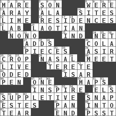 ACROSS 1. Female horse 5. Boy, to dad 8. Past tense of be (plural) 12. Like ___ of sunshine 13. Chicken ___ king 14. Locates 15. Welles in "The Third Man" 16. Dwellings 19. Experiment locale 20. Of or relating to Laos or its people 21. Words to Nanette 23. Working for oneself (abbr.) 24. Fish or hair follower 27. Does sums 30. Root beer relative 31. Components 34. SW Saudi Arabia district 35. Riding implement 38. Rhinal 40. Confront 41. Not recorded 42. Cylindrical with tapered ends 44. Wrote a lyric poem 45. Austrian river, tributary to the Danube 46. Fenced enclosure 47. Single 50. Atlas contents 53. Stimulate to action 57. Raised railways 59. Supplying deficiencies 63. Fastener 64. _____ Park, CO 65. Baking dish 66. To the inside or interior of 67. Rend 68. Conclude 69. Inconspicuous attention getter DOWN 1. Shopping center 2. Believer in; advocate of (suffix) 3. Role for Stallone 4. Sight organ 5. "Two Mules for Sister ____" 6. Margarine 7. Political cartoonist Thomas 8. Acquire through effort 9. And so on (abbr.) 10. To sift 11. Double-curved letter 14. Post 17. One more than two 18. Daniel's nick name 20. Farming town in central California 22. Slept 24. Characteristic smell of wine 25. Writer Wiesel 26. Small pie 28. Lair 29. Jazz singing style 30. Device for capturing images 32. Compass dir. 33. Indian skirt 35. Hoof sound 36. Travel on an animal 37. Baking chamber 39. French article 43. Not wild 47. Lubricates 48. Compass dir. 49. Eastern Standard Time (abbr.) 51. Actor Sean's family 52. Narrow boards 54. Corncob 55. _ the terrible 56. Tear apart 58. Specific locale 59. Arrange properly for use 60. Purpose 61. Parent Teacher Assoc. 62. For each 63. Small drink